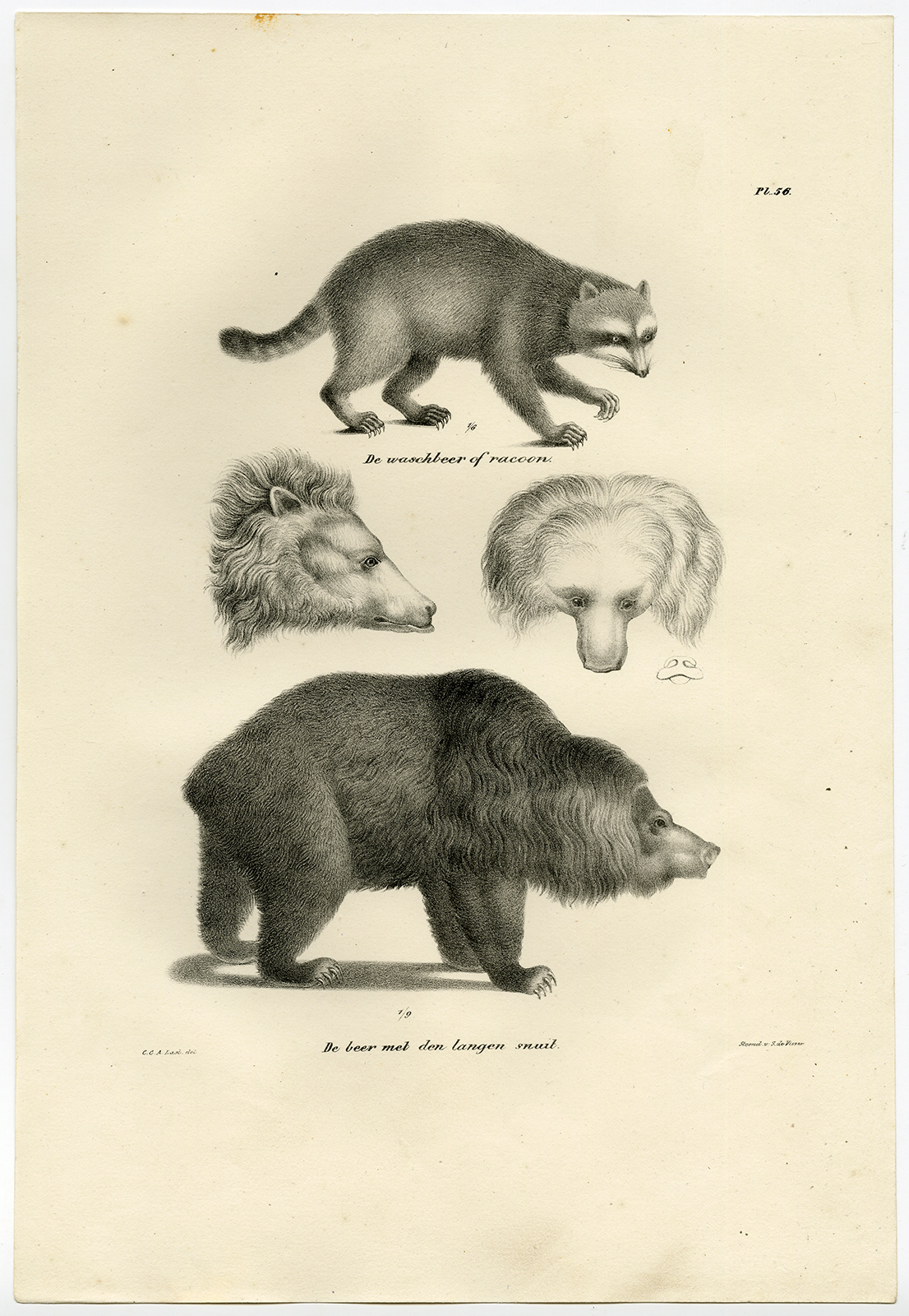 Onderwerp: Antieke prent, getiteld: ‘Plaat 56: ‘De waschbeer van wasbeer – De beer met den langen snuit’.’ – Op dit bord zijn de wasbeer en een andere berensoort ‘beer met de lange snuit’ afgebeeld.