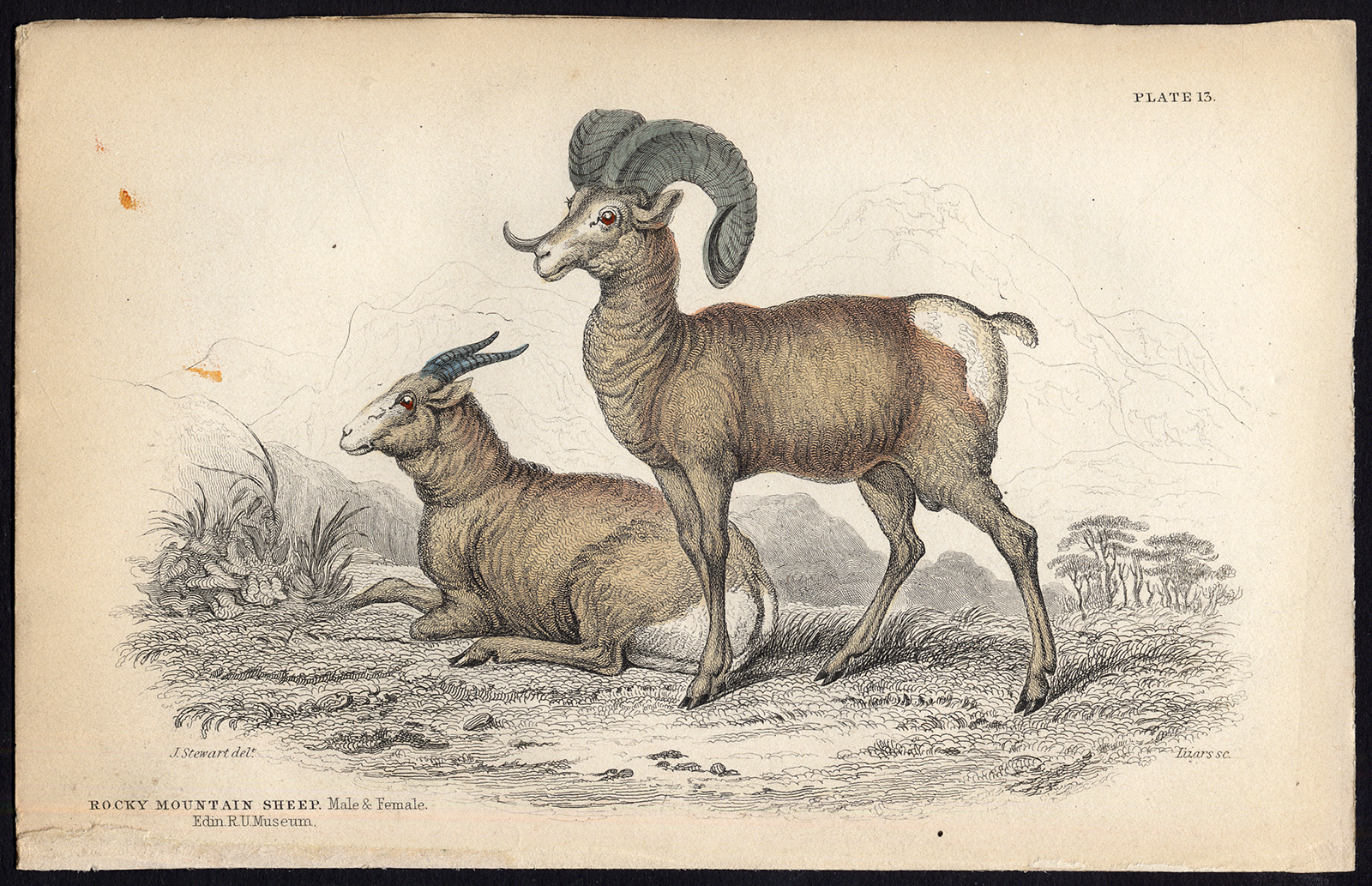 Onderwerp: Plaat 13: ‘Rocky Mountain Sheep, mannetje & vrouwelijk’. Op deze plaat is het dikhoornschaap (Ovis canadensis) afgebeeld.
