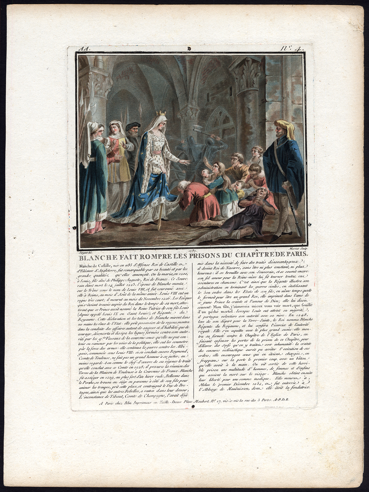 Onderwerp: Plaat: ‘Blanche fait rompre les gevangenissen du chapitre de Paris.’ (Blanche van Castille sluit de gevangenissen van het Parijse kapittel). Blanche van Castilië (1188 – 1252) was koningin van Frankrijk als echtgenote van Lodewijk VIII. Ze trad tweemaal op als regentes tijdens het bewind van haar zoon Lodewijk IX. Ze werd geboren in Palencia, Spanje, 1188, de derde dochter van Alfonso VIII, koning van Castilië, en Eleonora van Engeland. Beschrijvende tekst in het Frans onder de afbeelding.