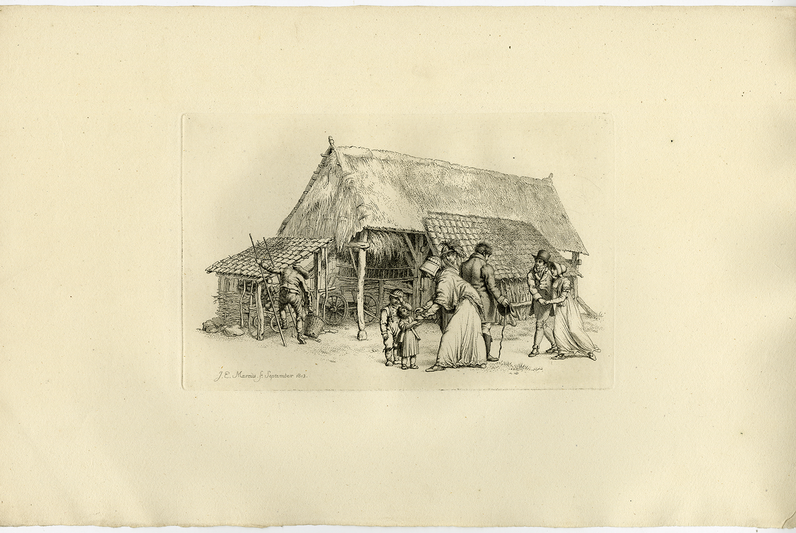 Onderwerp: Antieke druk, zonder titel. Een rietgedekte schuur met op de voorgrond een gezin, begin 19e eeuw. Grootmoeder geeft de kinderen munten terwijl vader het jonge stel begroet.