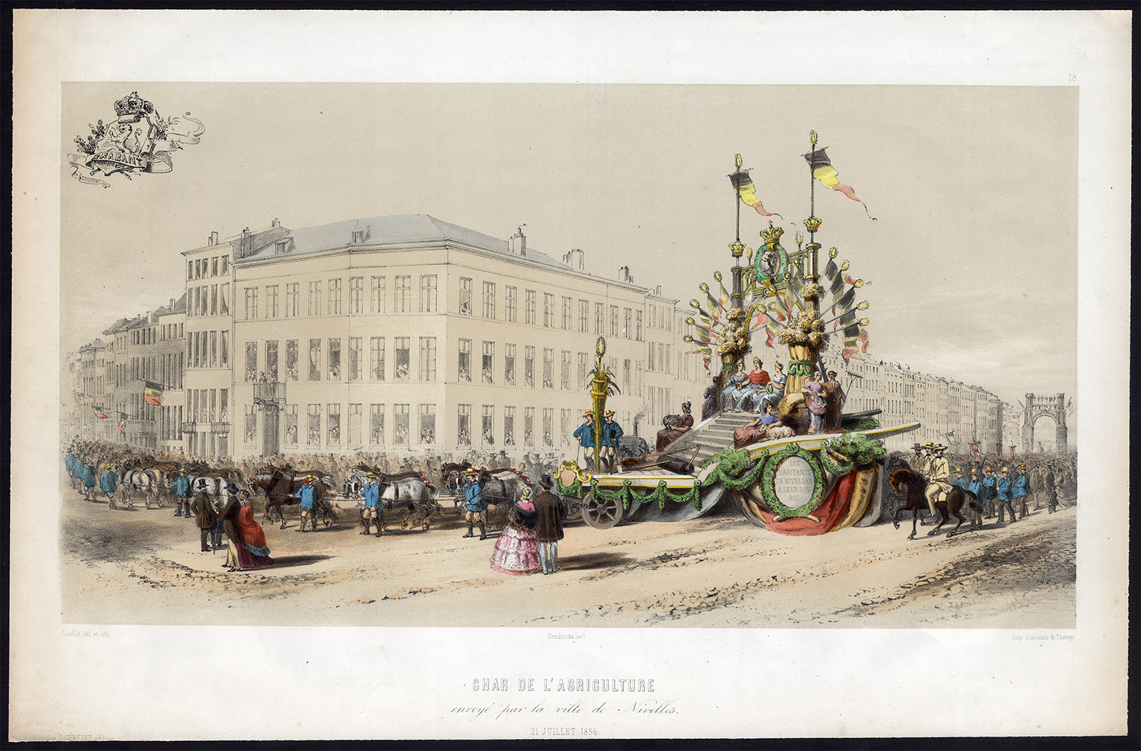 Antieke prent-BRUSSEL-FESTIVAL FLOAT-LANDBOUW-LEOPOLD I-BELGIË-Canelle-1856