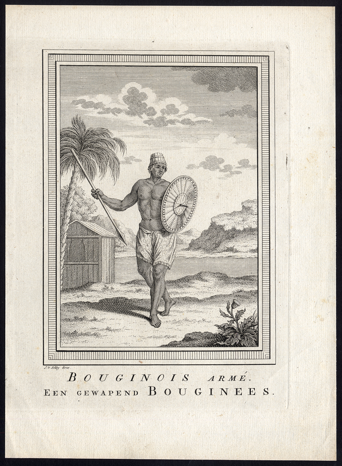 Onderwerp: Plaat: ‘Bouginois Arme – een versterkte Bouginees.’ Dit bord toont een gewapende man uit Sulawesi, Indonesië.