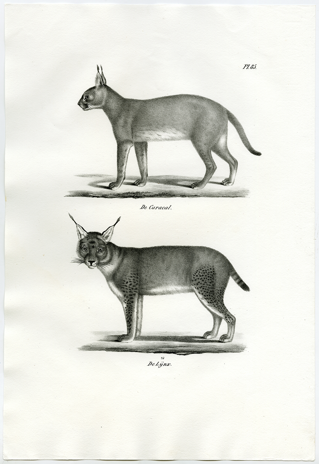 Onderwerp: Antieke prent, getiteld: ‘Pl. 85. De Caracal-De Lynx.’ – Op dit bord zijn een caracal en een lynx afgebeeld.