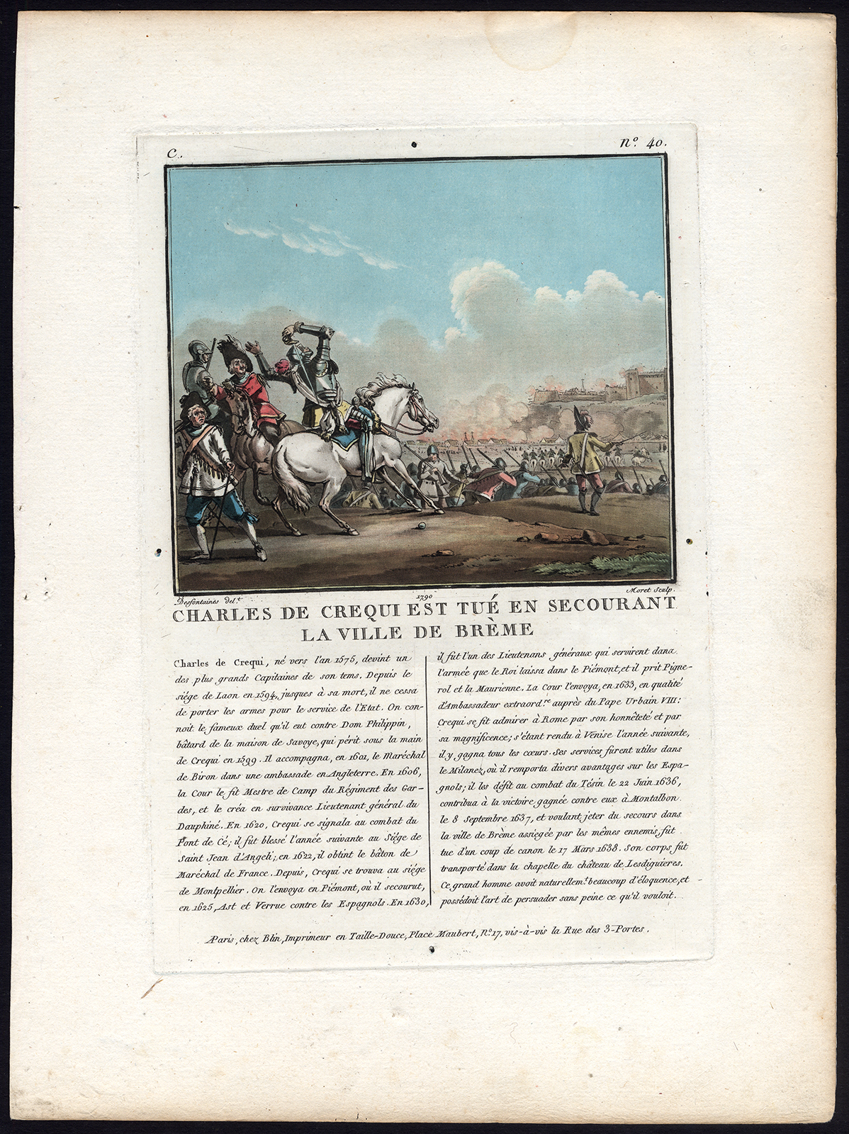 Onderwerp: Plaat: ‘Charles de Crequi est tue en secourant la ville de Breme.’ (Charles wordt vermoord vóór Breme, Italië). Charles I de Blanchefort, markies de Crequy, prins de Poix, hertog de Lesdiguieres, (1578 – 1638), was een maarschalk van Frankrijk. Beschrijvende tekst in het Frans onder de afbeelding.