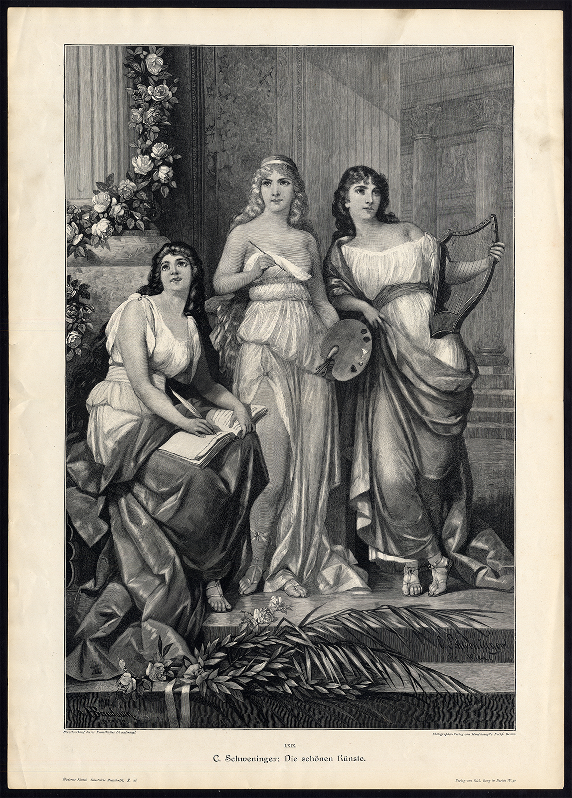 Antieke prent-DE SCHONE KUNSTEN-POËZIE-MUZIEK-SCHILDERIJ-VROUWEN-MUSE-Schweninger-1895