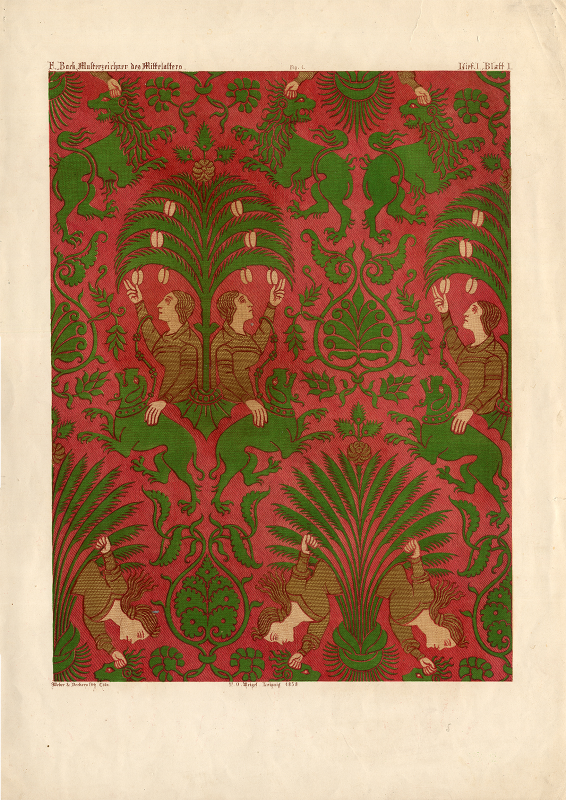 Beschrijving: Deze zeldzame antieke prent komt uit ‘Die Musterzeichner des Mittelalters’ van Franz Bock uitgegeven door Weigel in Leipzig ca. 1860. De ontwerper van de middeleeuwen. Studiegidsen voor vak- en reclamescholen, voor ornamentontwerpers, voor fabrieken van paramentunstoffen, tapijten en behangpapier, naar oude originele stoffen uit eigen collectie. De publicatie werd in delen uitgegeven door Franz Johann Joseph Bock tussen 1858-1861 . Het werd uitgegeven als losse platen.