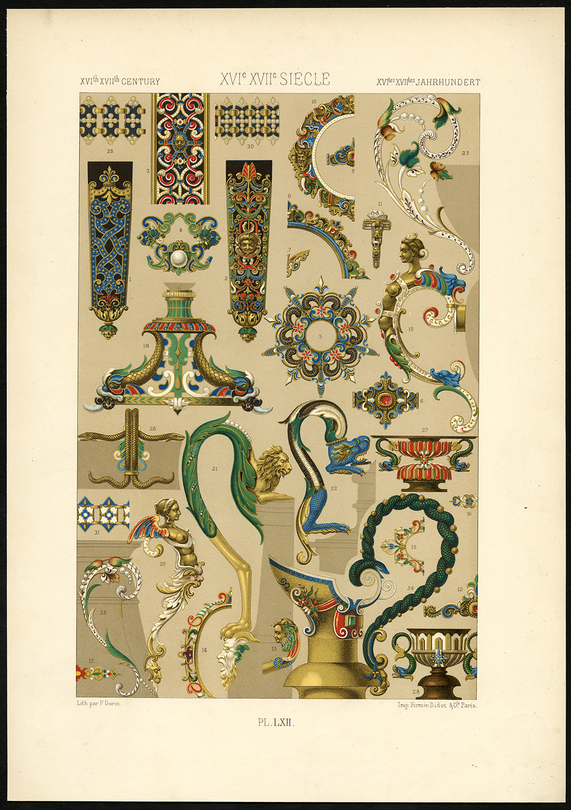 Antieke prent-DESIGN-ORNAMENT-17e-16e eeuw-LXII-Racinet-ca. 1870