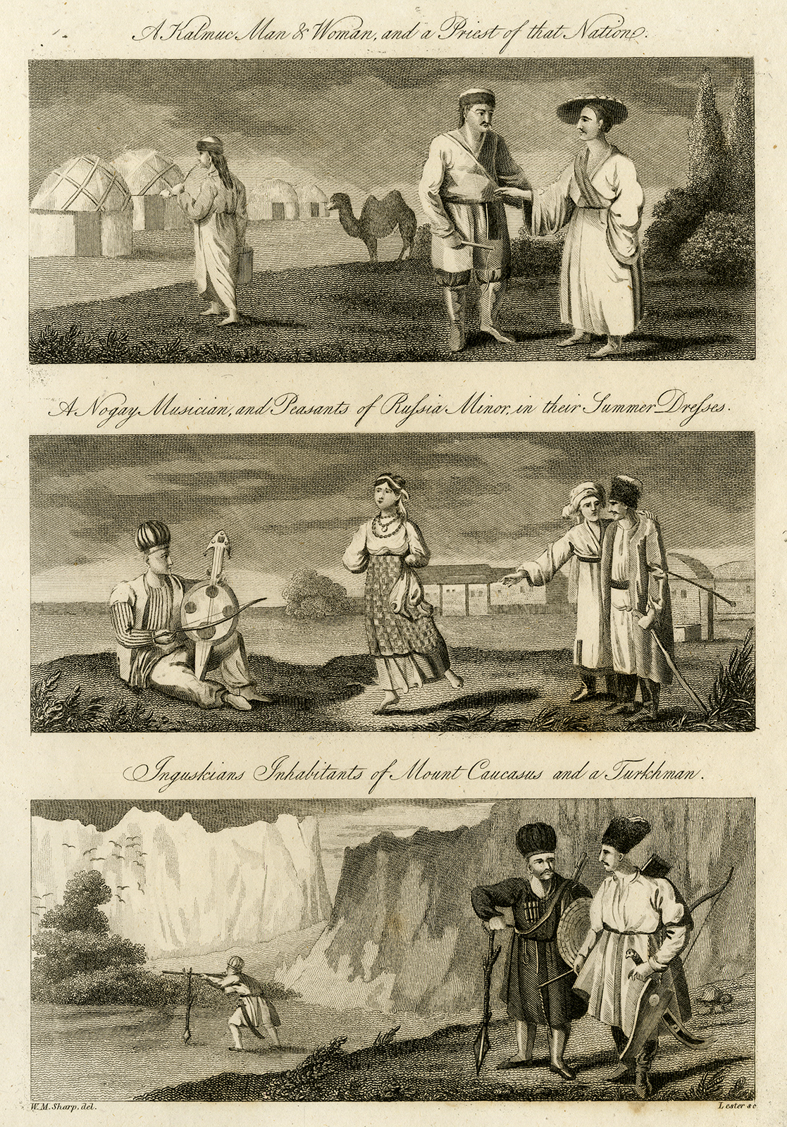 Onderwerp: Plaat: ‘Een Kalmuc-man & vrouw en een priester van die natie – een Nogay-muzikant en kleine boeren uit Rusland in hun zomerjurken – Ingoeskiërs, inwoners van de berg Kaukasus en een Turkman’. Dit bord toont de klederdracht en gebruiken van het Kalmyk-volk, mensen uit Rusland, Kaukasiërs enz., begin 19e eeuw.