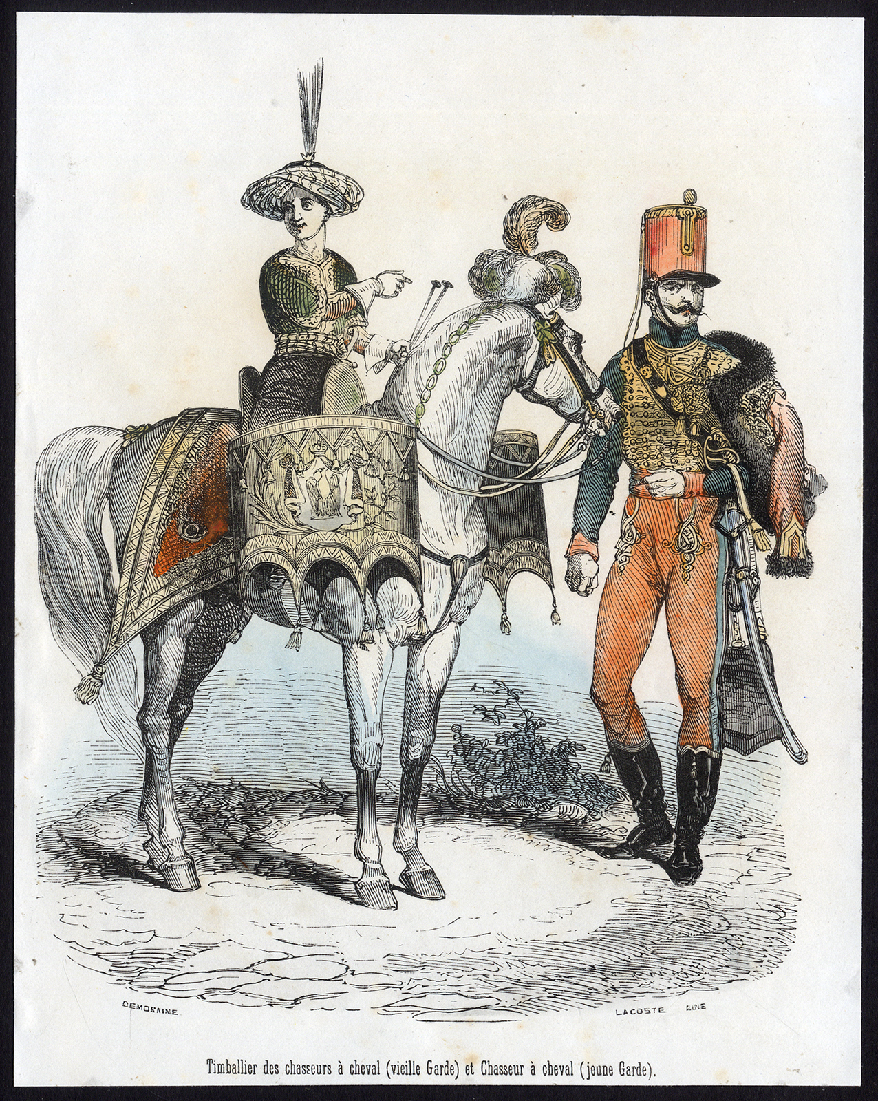 Antieke prent-DRUMMER-ARMY-JACHTMAN-PAARD-MILITARY-Lacoste-De Moraine-1845
