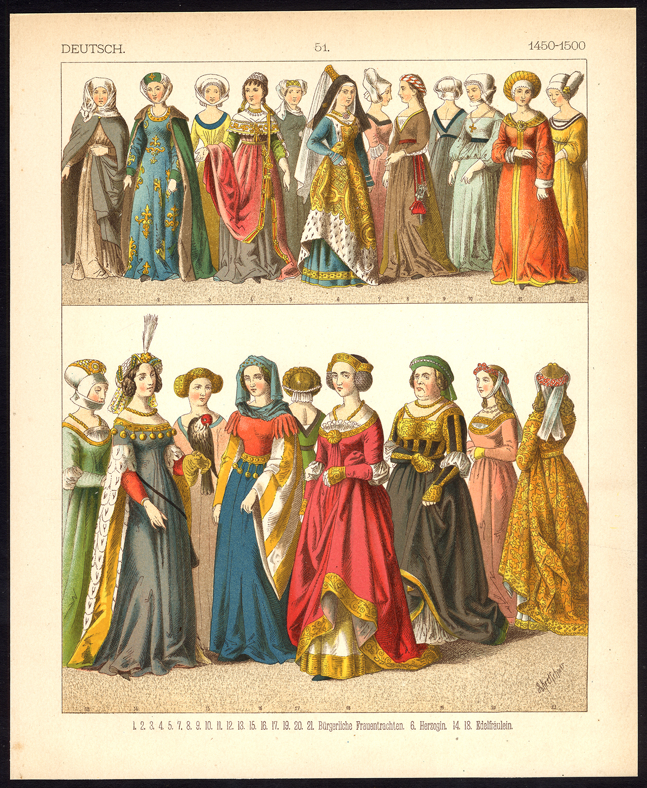 Onderwerp: Plaat 51: ‘Deutsch – 1450-1500.’ Dit bord toont Duitse kostuums uit ongeveer 1450-1500 n.Chr.; burgerlijke kleding, hertogin, adel etc.