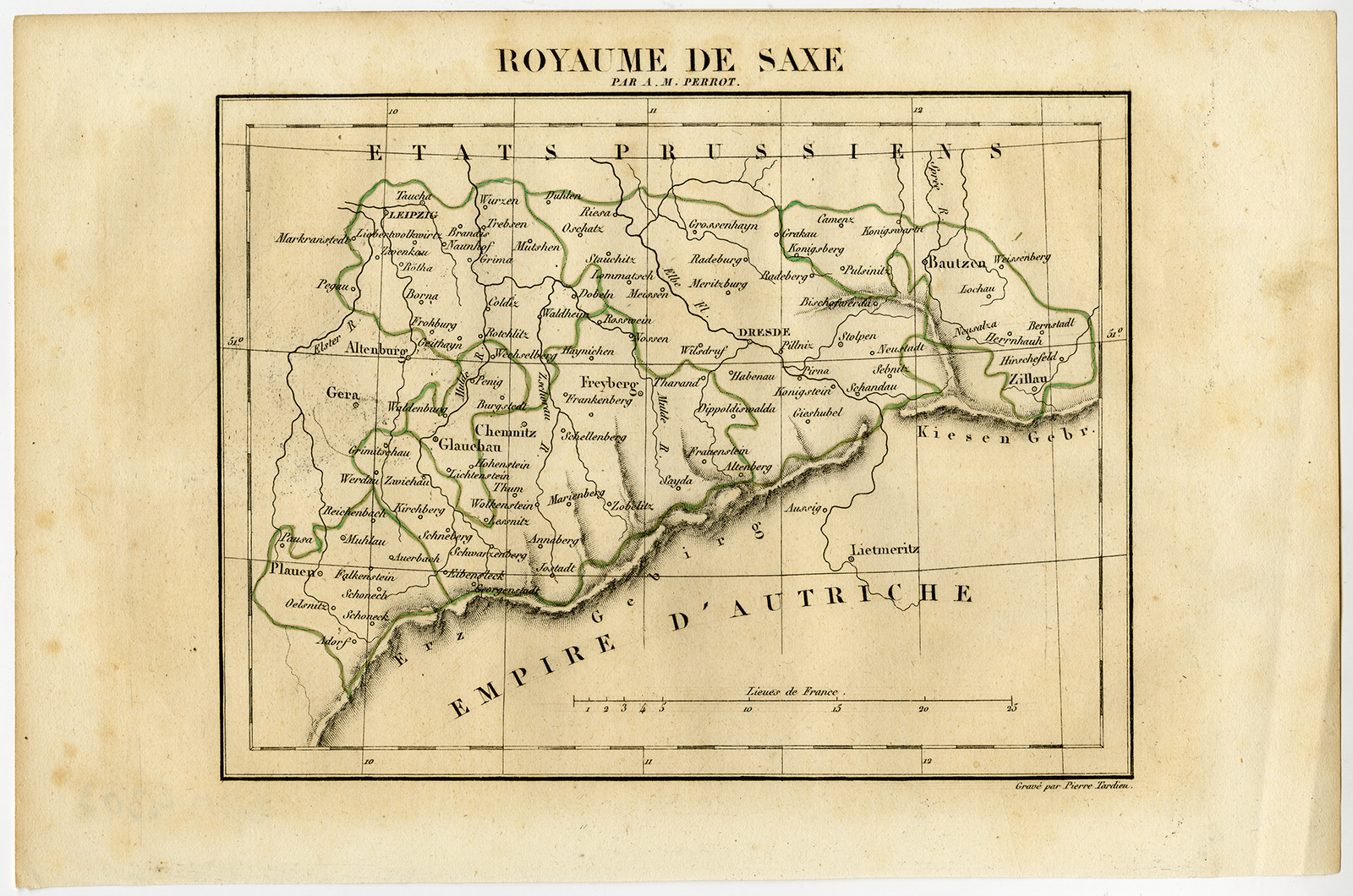 Onderwerp: Antieke prent, getiteld: ”Royaume de Saxe par AM Perrot.” – Deze originele antieke kaart toont de regio Saksen, Duitsland.