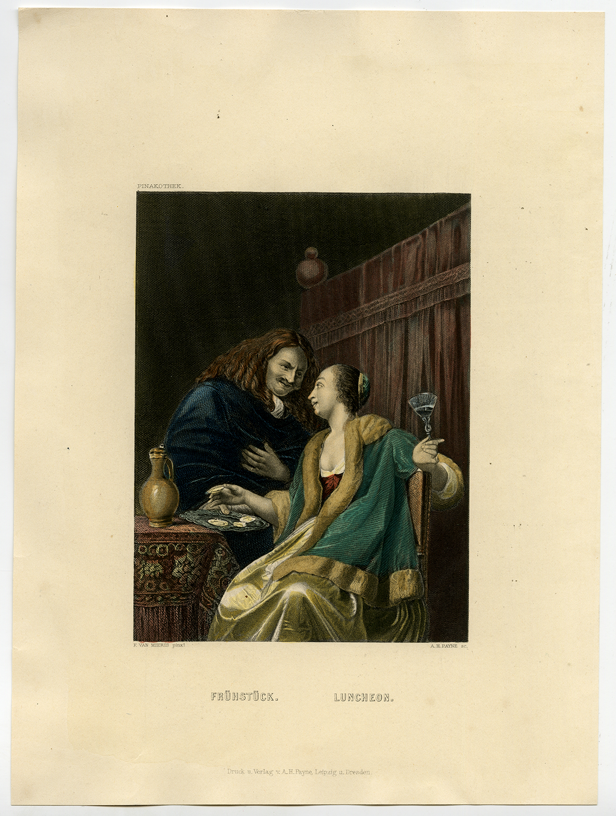 Kunstenaars en graveurs: Gemaakt door ‘AH Payne’ naar ‘F. van Mieris’. Albert Henry Payne (Londen 1812 – Leipzig 1902) was een staalgraveur, schilder en illustrator. Hoewel hij Engelsman was, woonde hij vanaf 1839 in Leipzig.