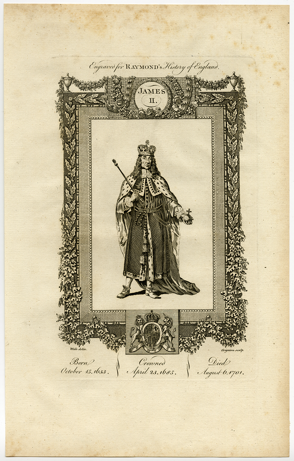 Antieke prent-ENGELAND-KING JAMES II-PORTRET-Wale-Grignion-1784
