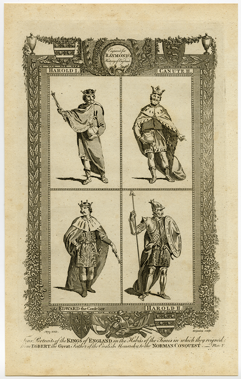 Antieke prent-ENGELAND-KONING HAROLD II-CANUTE-EDWARD-Metz-Grignion-1784