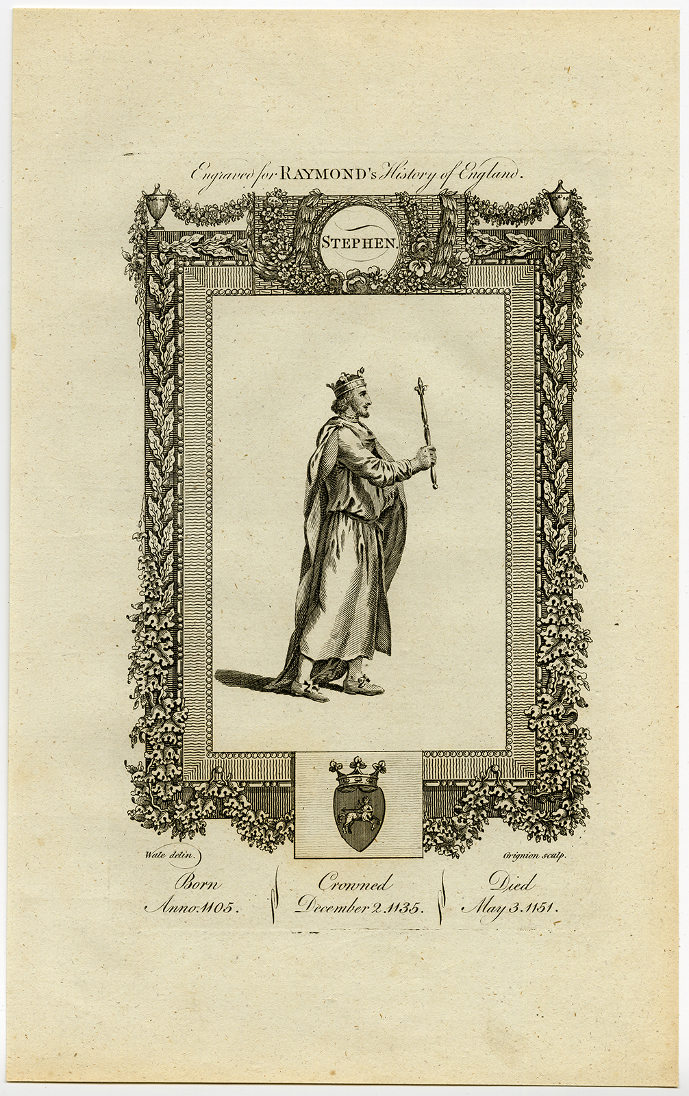 Antieke prent-ENGELAND-KONING STEPHEN-PORTRET-Wale-Grignion-1784