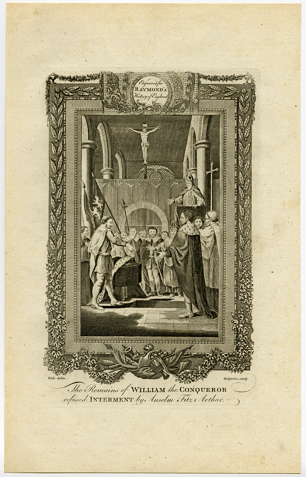 Onderwerp: Antieke prent, getiteld: ‘De overblijfselen van Willem de Veroveraar weigerden begrafenis door Anselm Fitz-Arthur.’ – Dit bord toont een scène uit de Engelse geschiedenis. Omgeven door decoratieve randen.