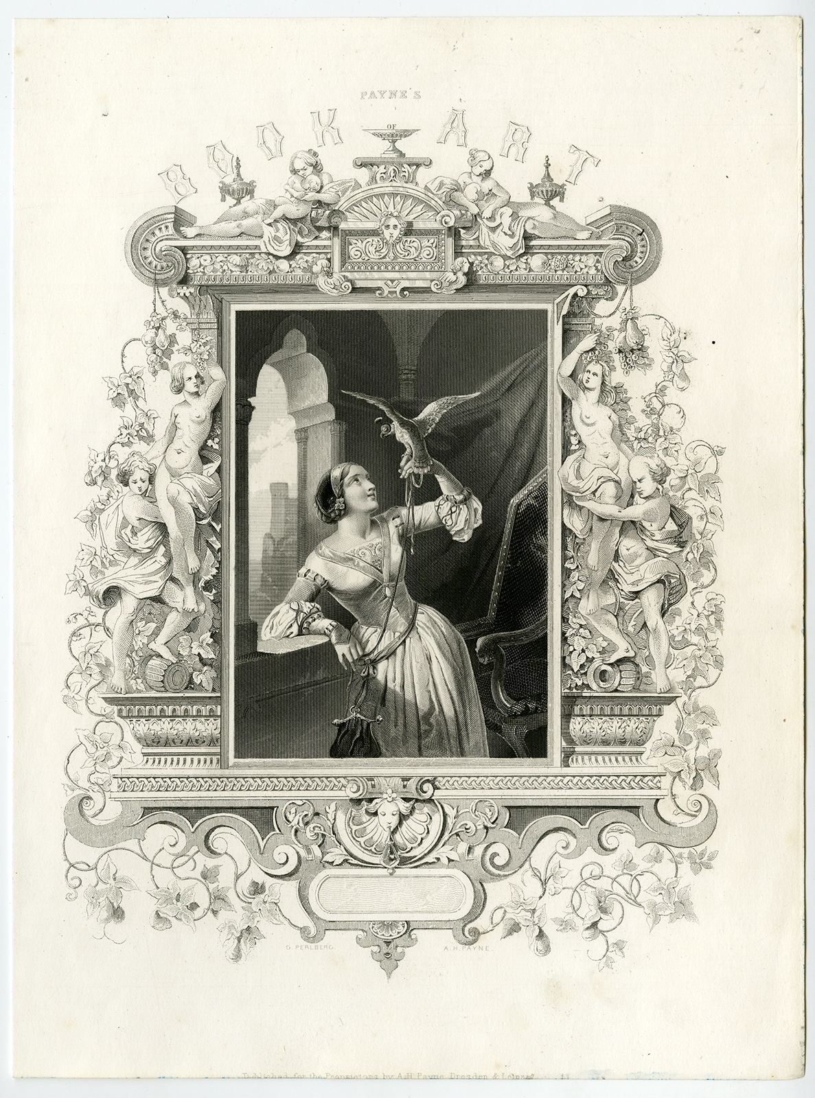 Onderwerp: Plaat: Frontispice met de titel ‘Payne’s Book of Art’, voorstellende een jonge vrouw met een valk. Omringd door allegorische grenzen.