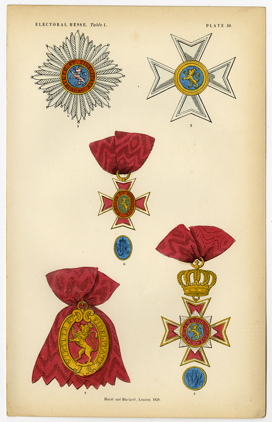 Onderwerp: Plaat 40: Dit bord behandelt ridderorden en eretekens en toont de Familieorde van de Gouden Leeuw en andere medailles van verdienste en onderscheidingen van Electoraal Hessen, Duitsland.