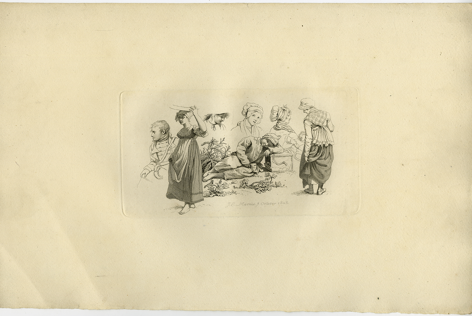 Onderwerp: Antieke druk, zonder titel. Figuurstudies: een soldaat; een vrouw met een platte mand op haar hoofd; drie vrouwelijke portretten; een jongen die zijn hoofd op een houten kist laat rusten; een portret van volledige lengte van een boerin die de zoom van haar jurk optilt.