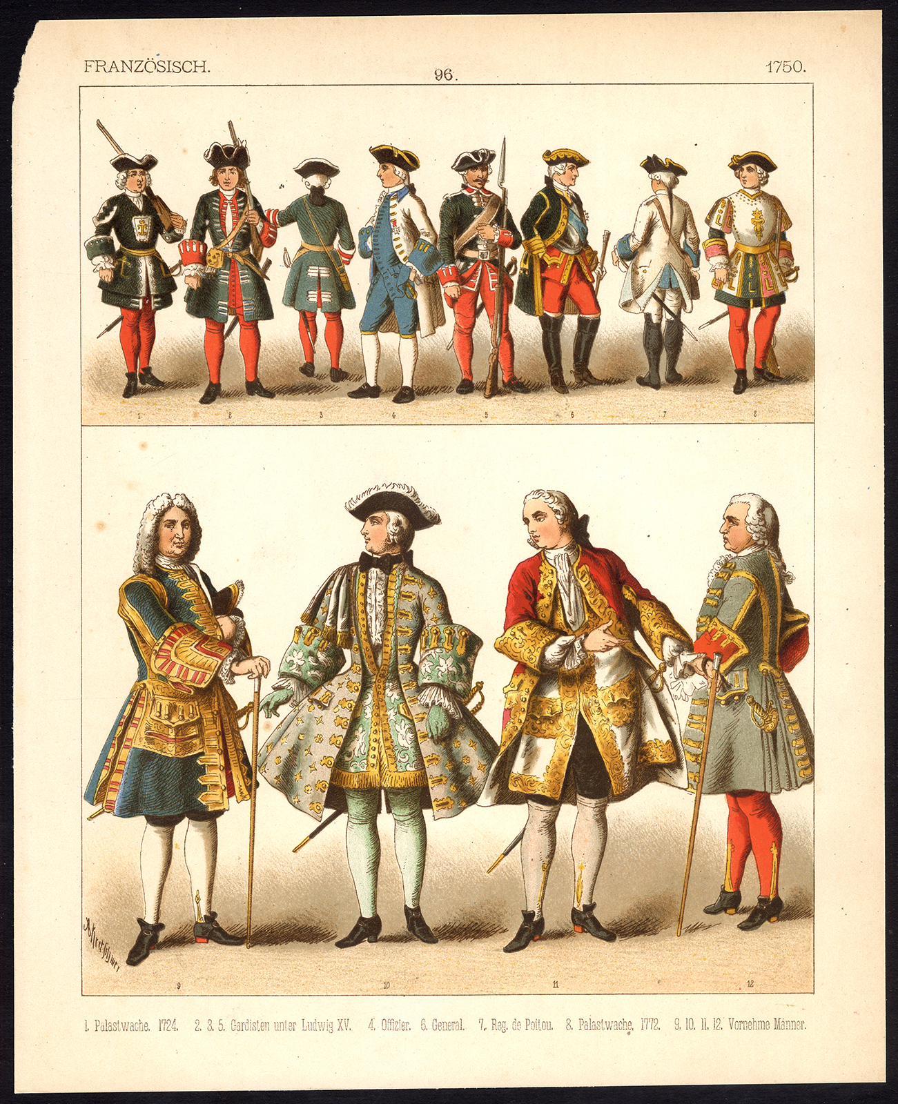 Onderwerp: Plaat 96: ‘Franzosisch – 1750.’ Dit bord toont Franse kostuums van rond 1750 n.Chr.; paleiswachten, gardisten onder Lodewijk XV, officier, generaal, adel etc.