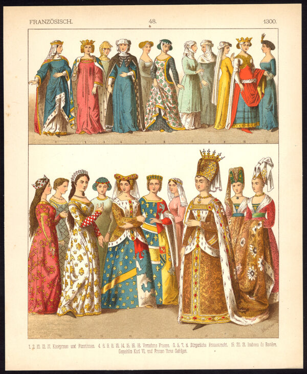 Onderwerp: Plaat 48: ‘Franzosisch – 1300.’ Dit bord toont Franse kostuums van rond 1300 na Christus; adel, koninginnen, Isabeau de Baviere, Karl VI etc.
