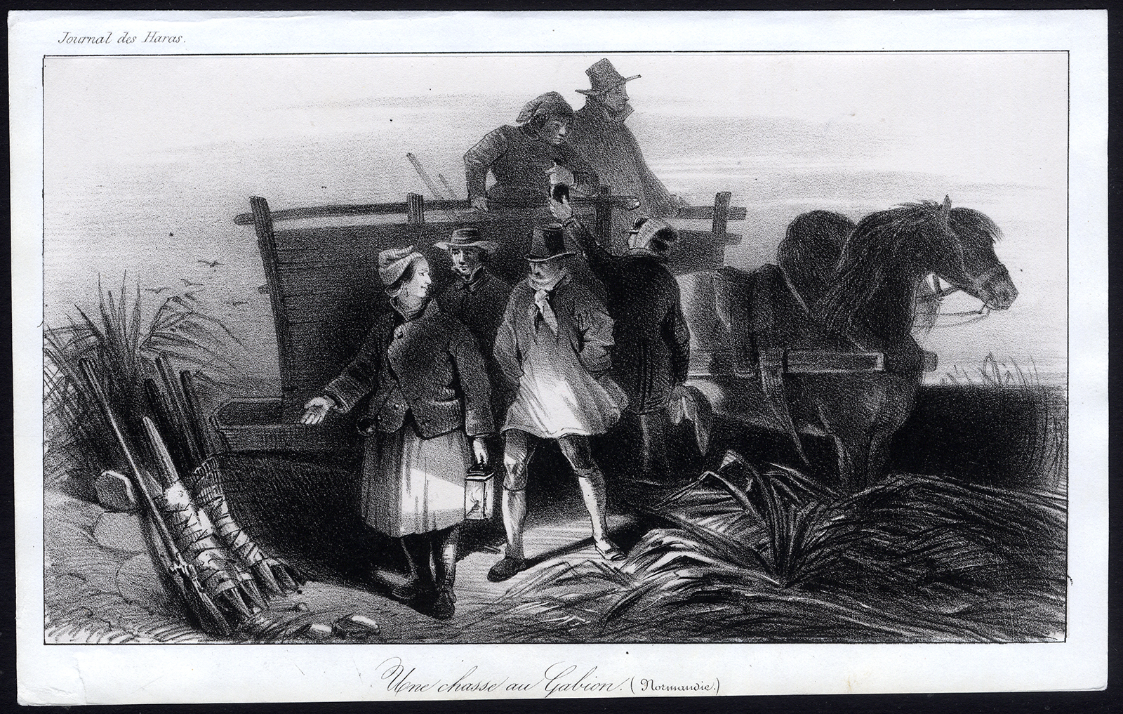 Onderwerp: Plaat: ‘Une chasse au Gabion, Normandie’. (De schanskorfjacht). Dit bord toont jagers en een paard.