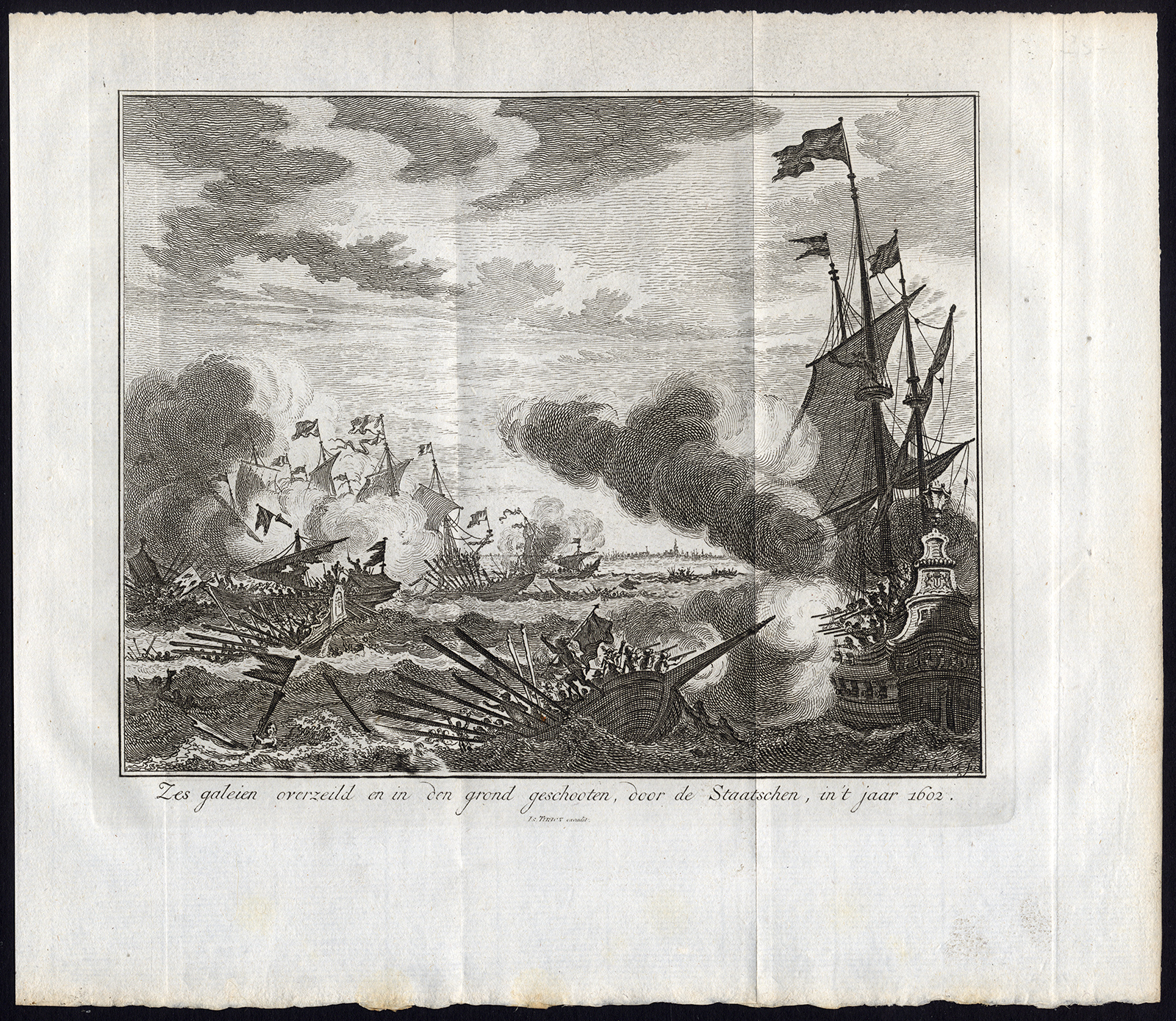 Onderwerp: Plaat: ‘Zes galeien overzeild en in den grond geschooten door de Staatschen in ’t jaar 1602.’ Dit bord toont de Spaanse galeien die in de Tachtigjarige Oorlog door de Nederlandse Staten zijn verwoest.