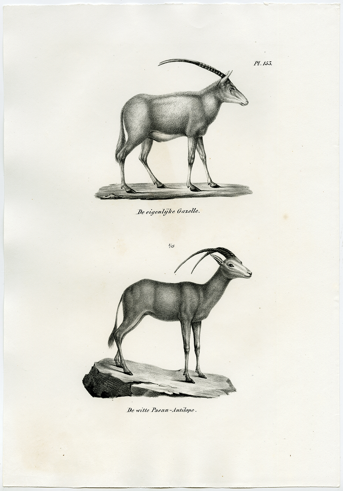 Onderwerp: Antieke prent, getiteld: ‘Pl. 153. De eigenlijke Gazelle – De witte Pasan-Antilope.’ – Op deze plaat zijn de Gazelle en Pasan antilope afgebeeld.