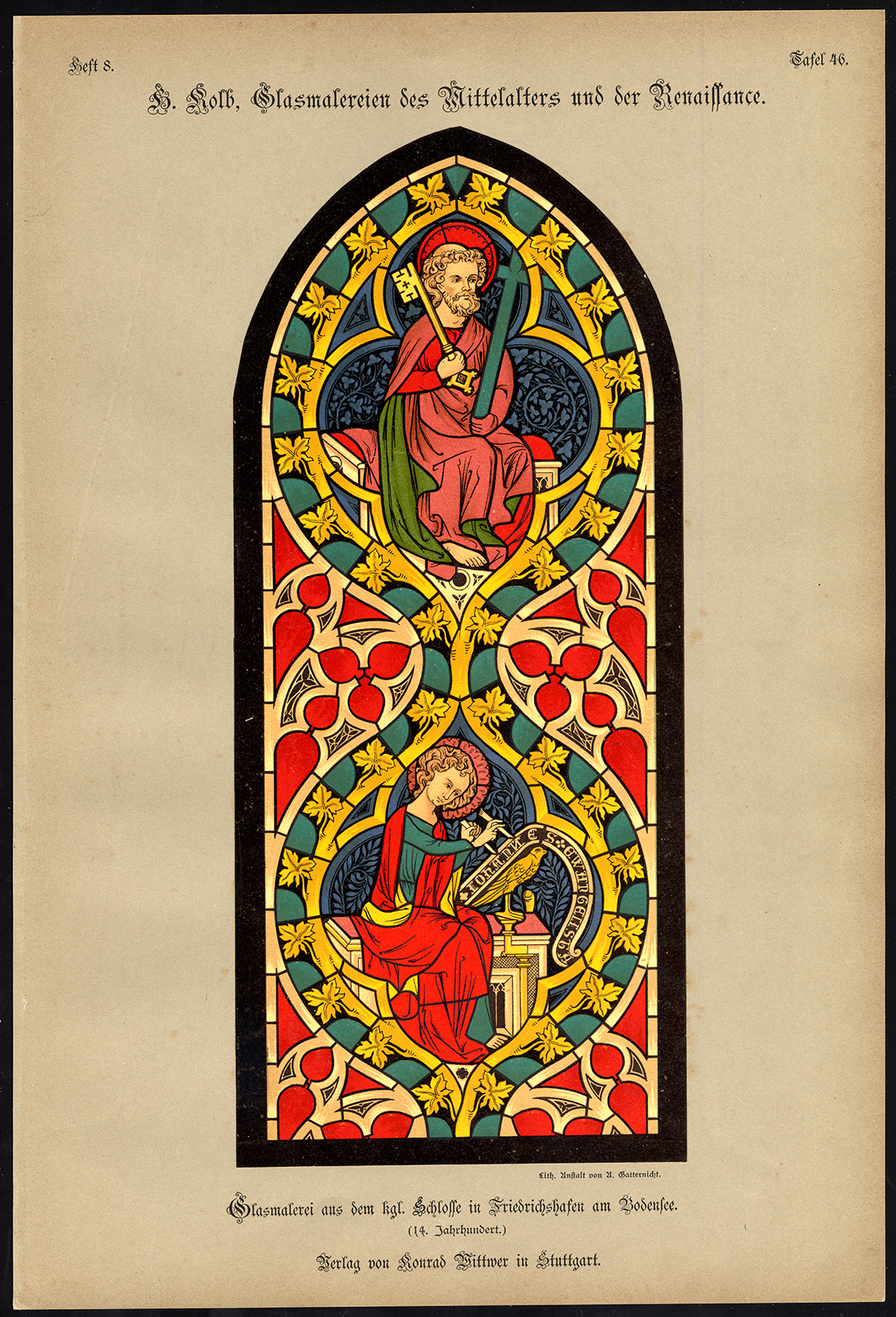 Onderwerp: Bord Tafel 46: ‘Glasmalerei aus dem Kgl. Schlosse in Friedrichshafen am Bodensee, vierzehntes Jahrhundert.’ (Gebrandschilderd raam van het koninklijk kasteel in Friedrichshafen aan de Bodensee, Duitsland, 14e eeuw).