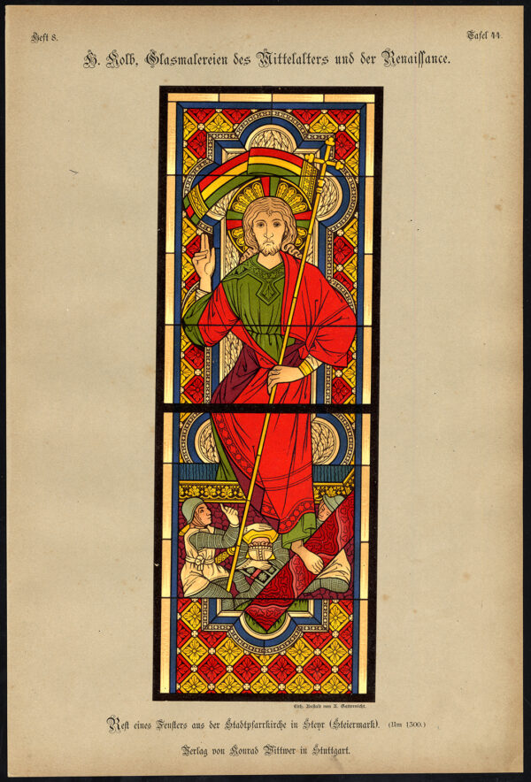 Beschrijving: Deze zeer zeldzame aantrekkelijke originele oude antieke prent/plaat is afkomstig uit: ‘Glasmalereien des Mittelalters und der Renaissance’ (Gebrandschilderd glas uit de middeleeuwen en renaissance.) van H. Kolb. Uitgegeven in Stuttgart door Conrad Wittwer Verlag 1884. De platen van folioformaat zijn gemonteerd op dik grijs karton, waarbij op sommige platen maar liefst vijf illustraties aan elke plaat zijn bevestigd. Sommige platen kunnen worden uitgeklapt en er verschijnen grote, weelderige illustraties.