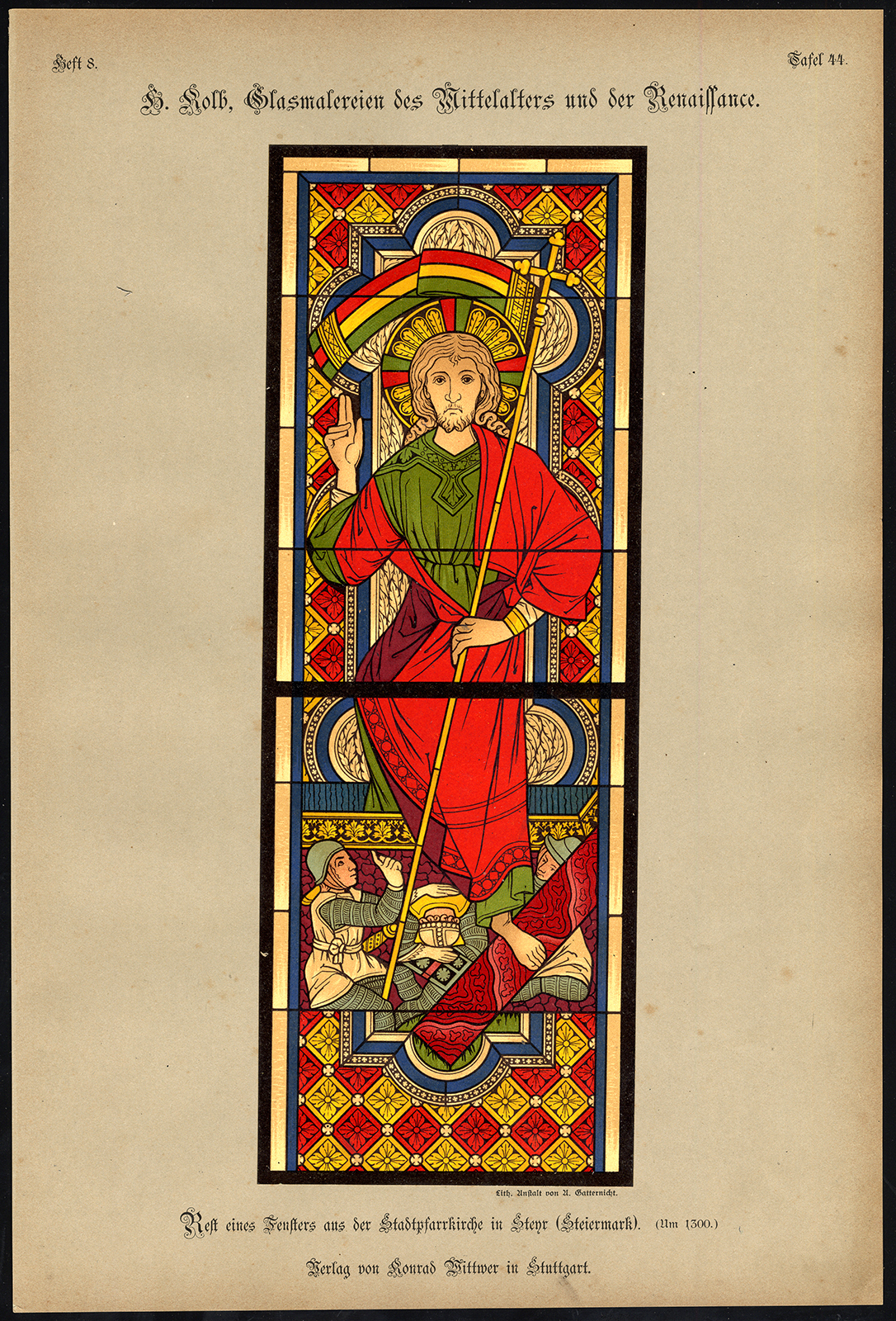 Onderwerp: Bord Tafel 44: ‘Rest eines Fensters aus der Stadtpfarrkirche in Steyr, Steiermark om 1300.’ (Gebrandschilderd raam van de Stadtpfarrkirche in Steyr, Oostenrijk rond 1300).