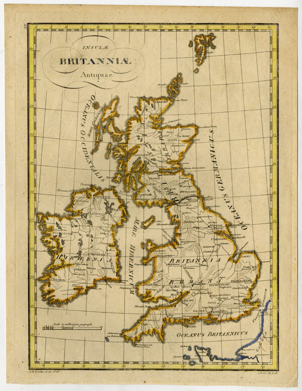 Onderwerp: Antieke prent, getiteld: ”Insulae Britanniae Antiquae.” – Historische kaart van Groot-Brittannië en Ierland in de Romeinse tijd.
