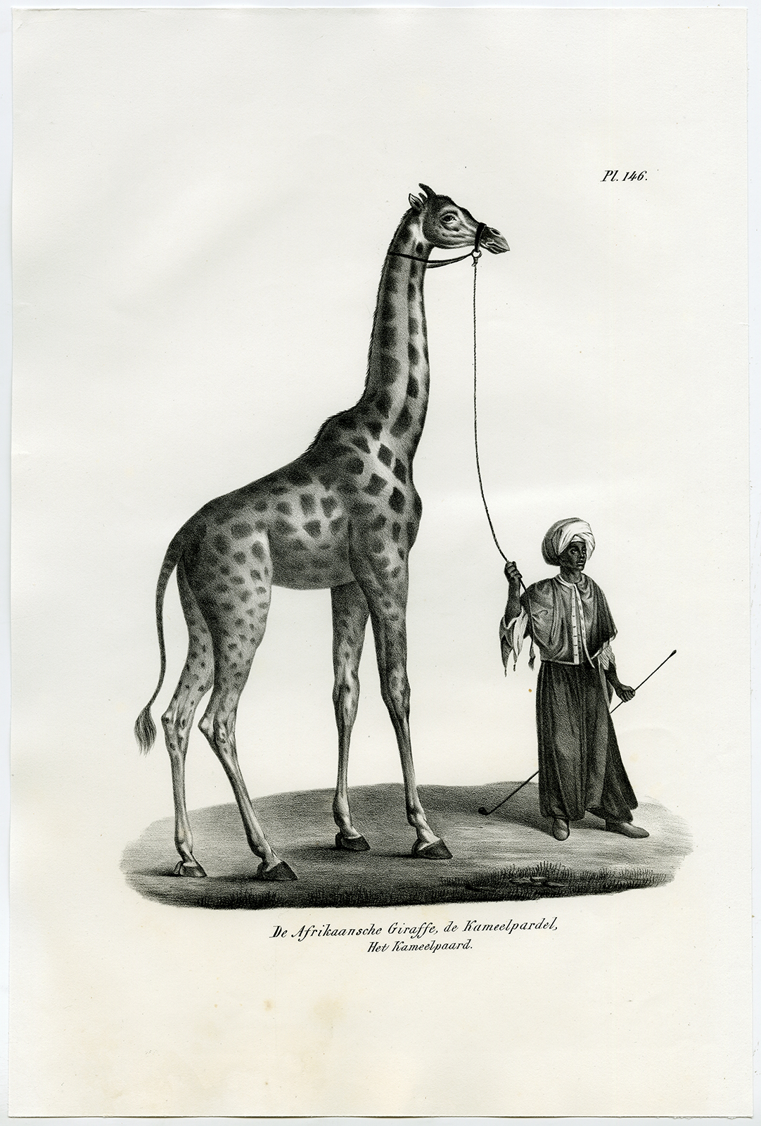 Onderwerp: Antieke prent, getiteld: ‘Pl. 146. De Afrikaansche Giraffe, de Kameelpardel, Het Kameelpaard.’ – Dit bord toont een giraffe met geleider.