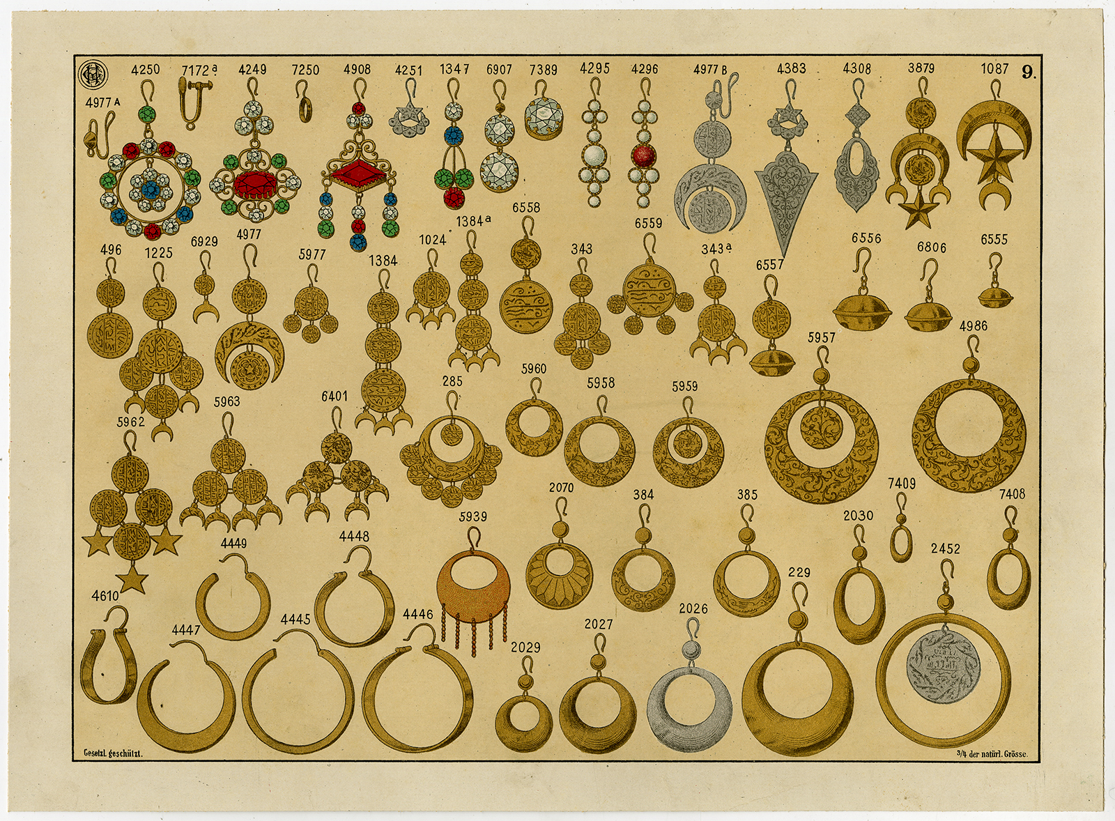 Antieke prent-GOUD-ZILVER-EDELSTENEN-SIERADEN-MEDAAL-PLAAT 9-Anoniem-c. 1890