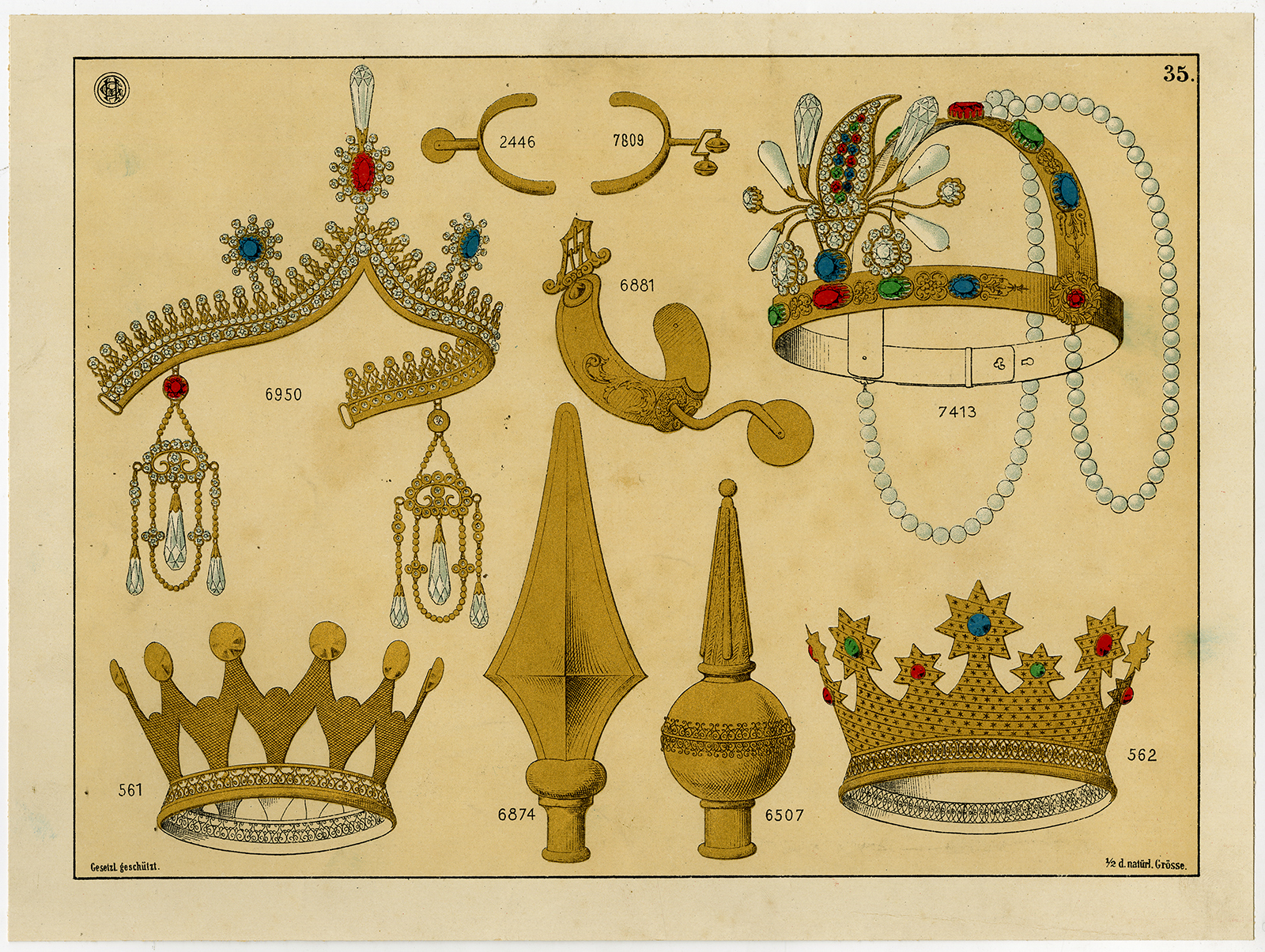 Antieke prent-GOUDEN-PARELS-GEMSTONE-SIERADEN-KROON-TIARA-PL 35-Anoniem-c. 1890