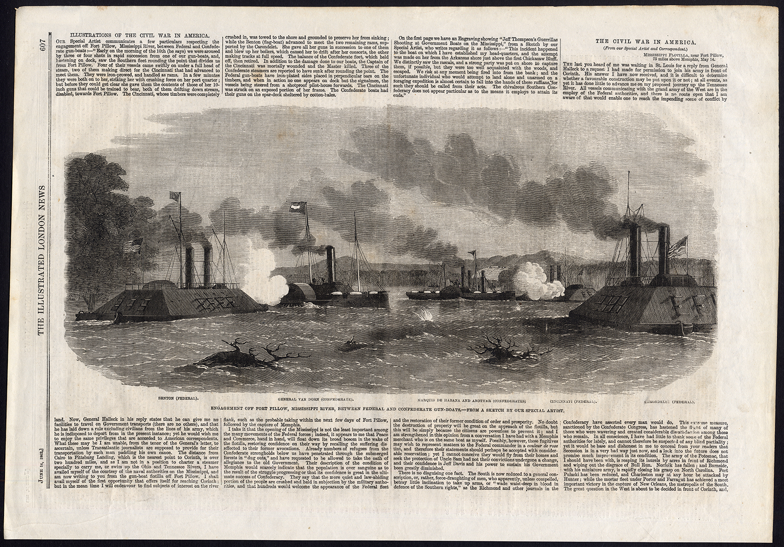 Onderwerp: Plaat: ‘Engagement bij Fort Pillow, Mississippi River, tussen federale en confederale kanonneerboten.’ Engelse tekst op achterzijde.