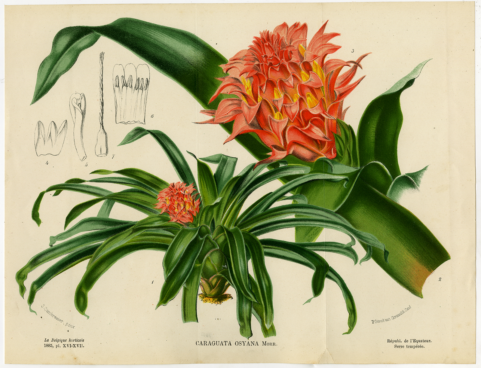 Antieke prent-GUZMANIA OSYANA-CARAGUATA-BROMELIA-PLANT-Stroobant-Morren-1883