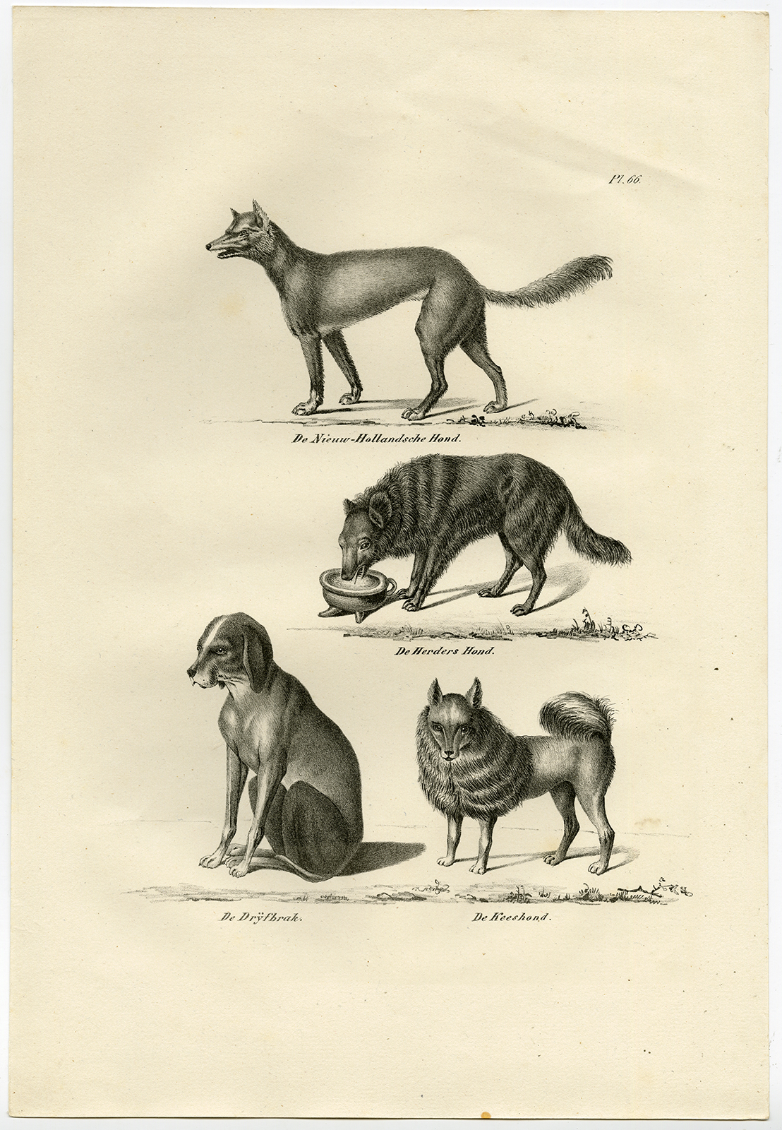 Onderwerp: Antieke prent, getiteld: ‘Plaat 66: ‘De Nieuw-hollandsche Hond – De Herders Hond – De Drijfbrak – De Keeshond’.’ – Op dit bord zijn een herdershond (herdershond), een braque (aanwijzend ras), keeshond enz. afgebeeld.