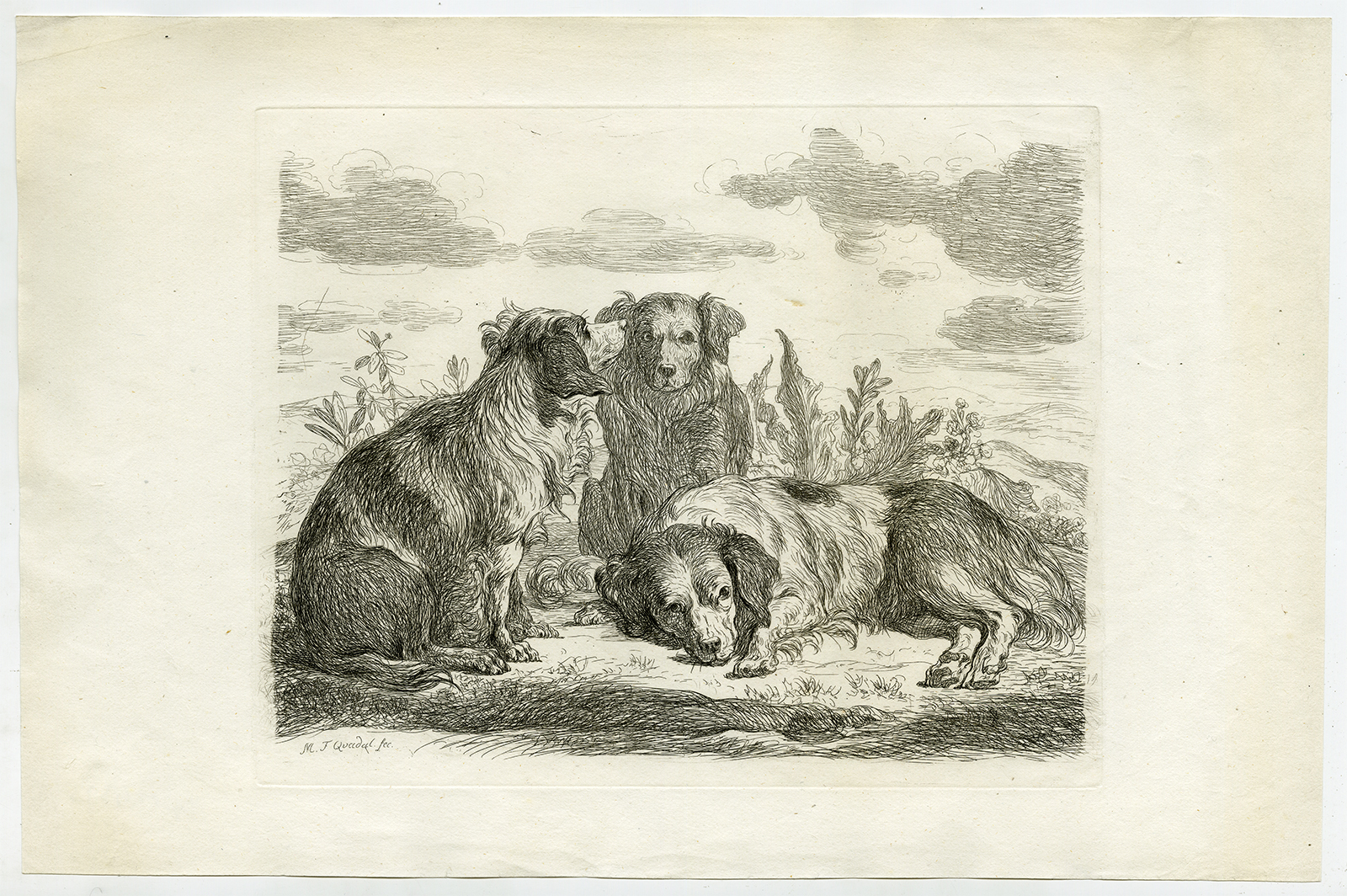 Onderwerp: Antieke druk, zonder titel. Drie (herders)honden in een landschap.