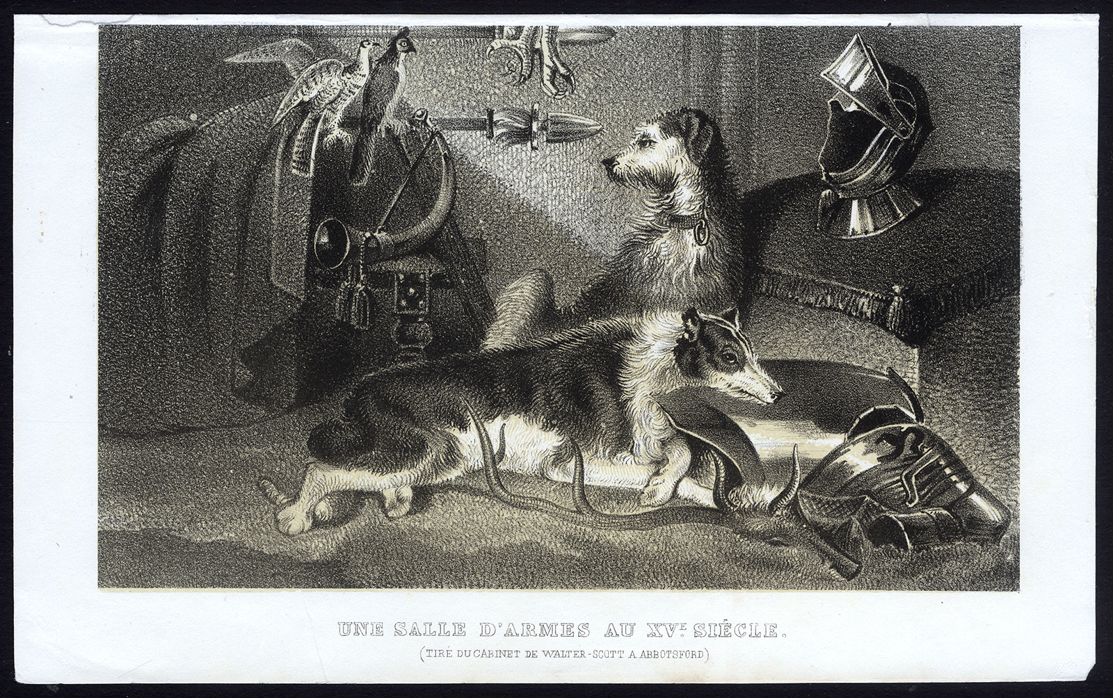 Onderwerp: Bord: ‘Une salle d’armes au XV siècle’. (Een wapenkamer in de 15e eeuw). Dit bord toont honden omringd door wapens en bepantsering.
