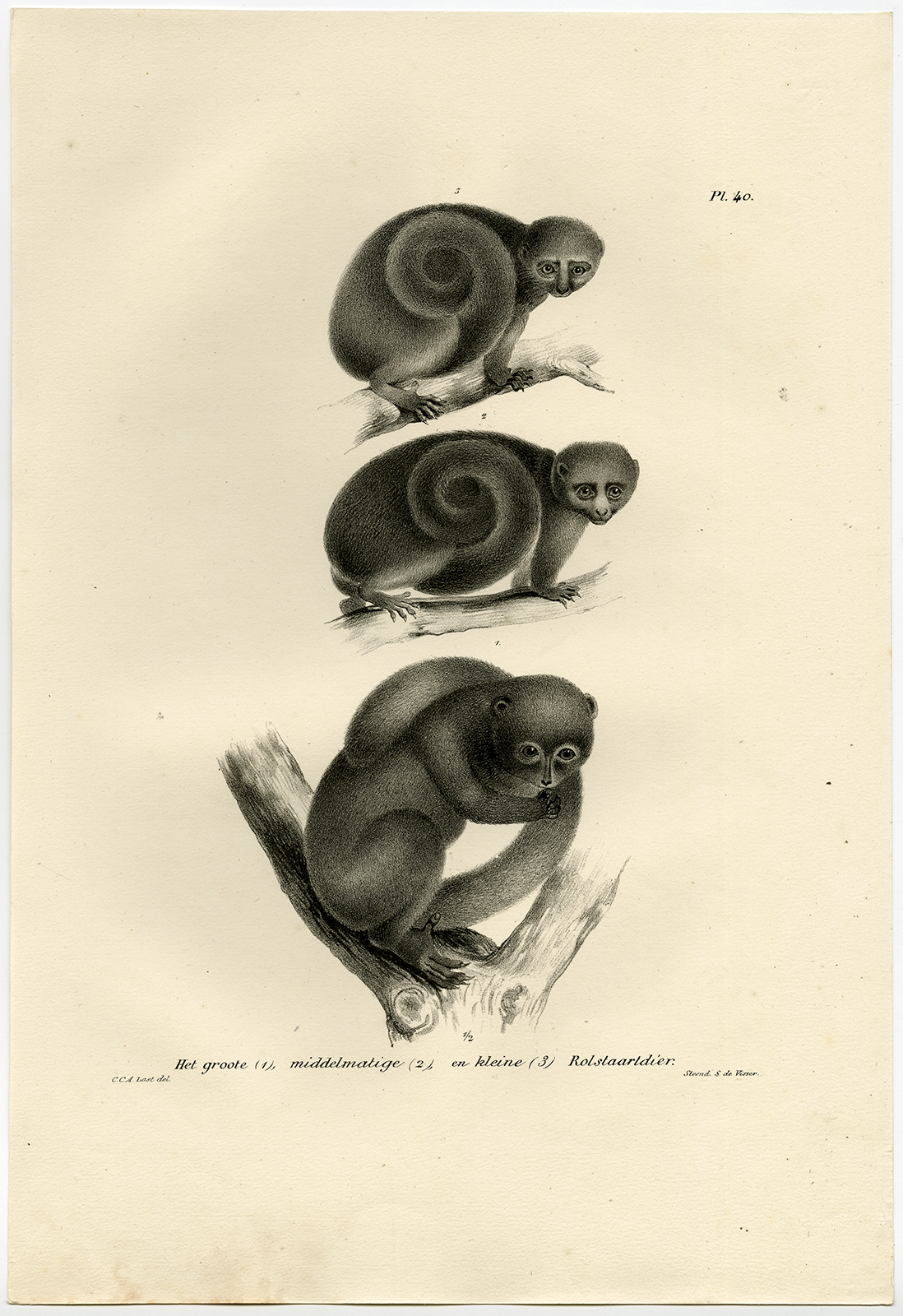 Onderwerp: Antieke prent, getiteld: ‘Plaat 40: ‘Het grootste, middelmatige en kleine rolstaartdier’.’ – Op dit bord zijn drie Kinkajou-soorten afgebeeld, ook wel Honingberen genoemd.