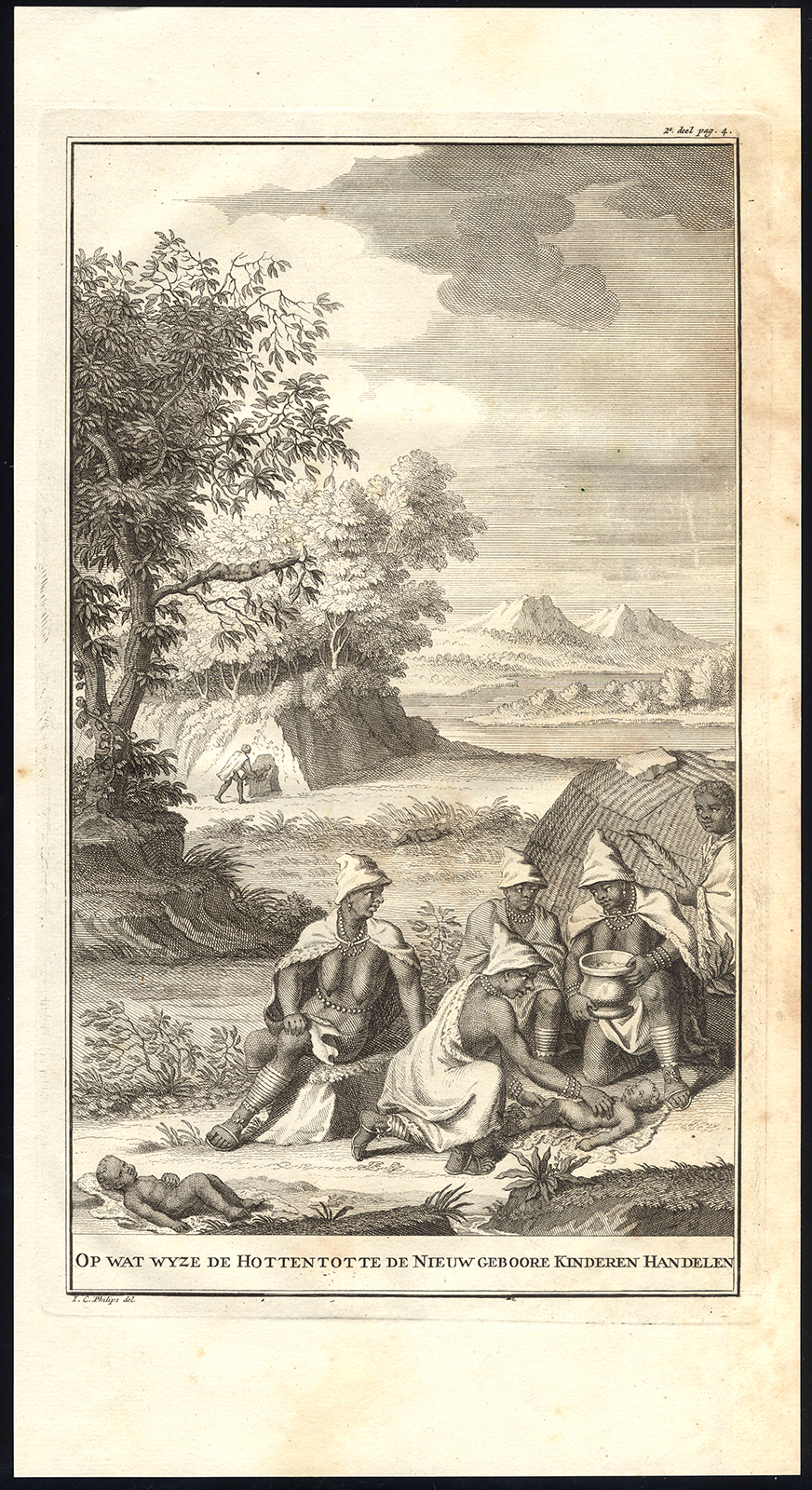 Onderwerp: Plaat pag. 4: ‘Op wat de Hottentotte de nieuwe geboore Kinderen handelde.’ Dit bord laat zien hoe de Hottentotten omgaan met hun pasgeboren kinderen. De Hottentotten van Zuidwest-Afrika heten tegenwoordig Khoikhoi.