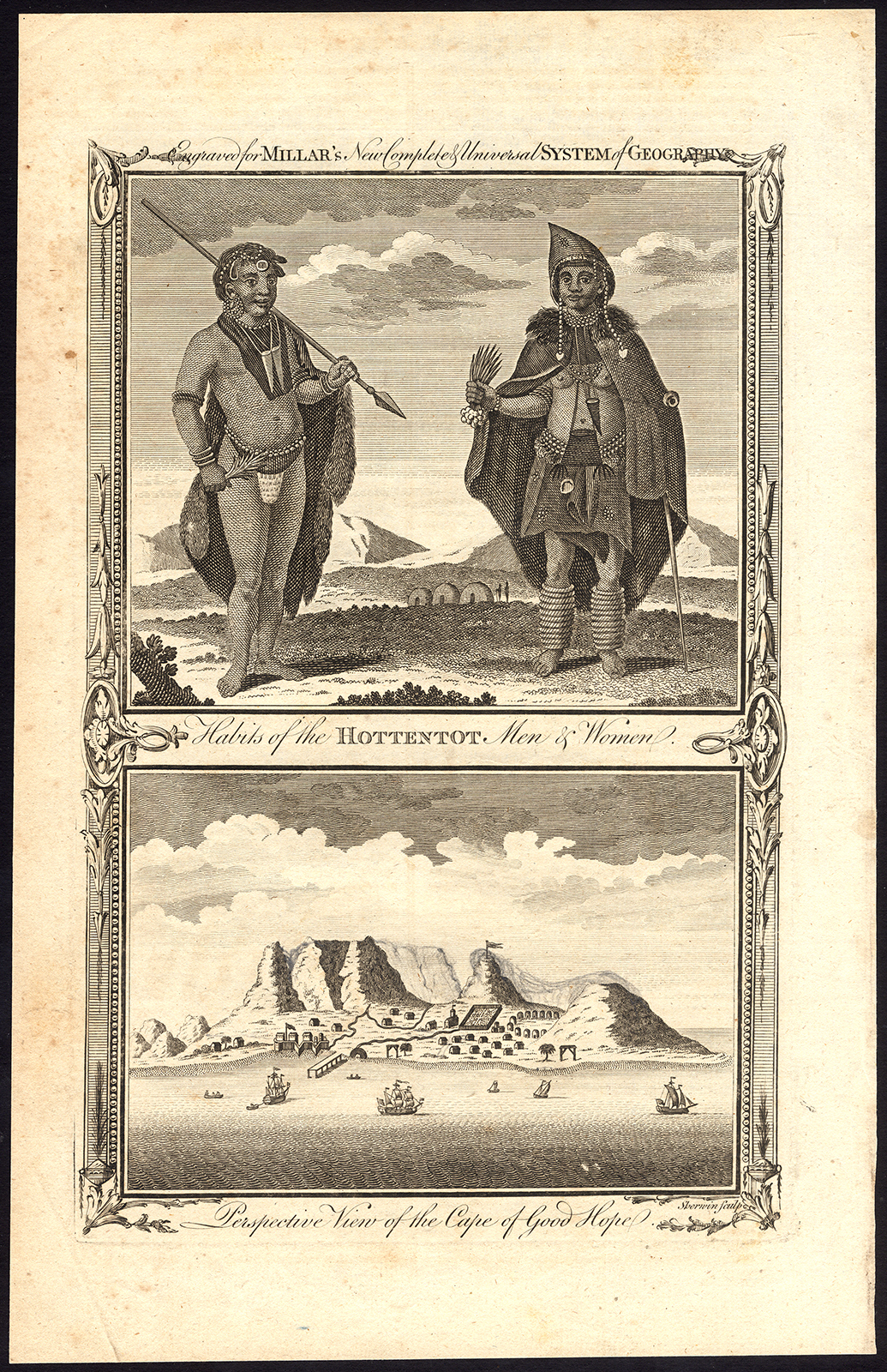 Onderwerp: Plaat: ‘Gewoonten van de Hottentotmannen & vrouwen – Perspectief van Kaap de Goede Hoop.’ Hottentotten worden tegenwoordig Khoikhoi genoemd.