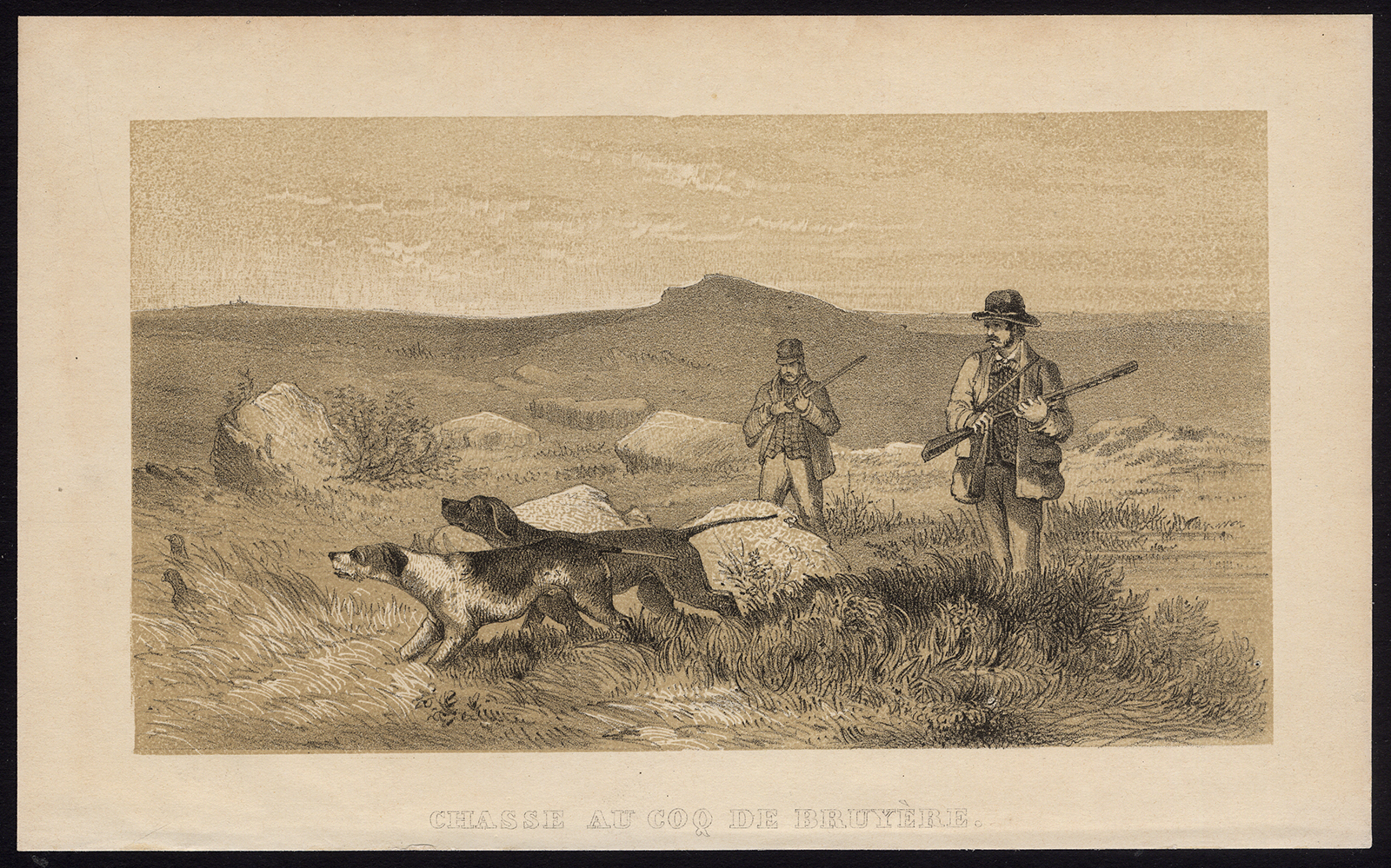 Onderwerp: Bord: ‘Chasse au coq de bruyere’. (jacht op korhoenders). Dit bord toont een jachttafereel met twee jagers met geweren en twee honden.