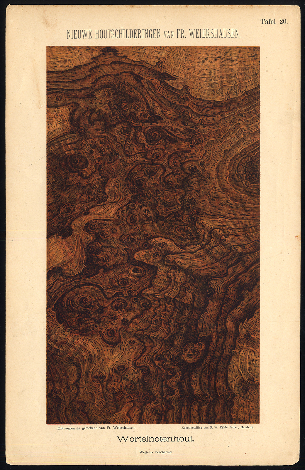 Onderwerp: Plaat 20: ‘Wortelnotenhout.’ (Okkernoot). Het laat de specifieke nerf en tint van deze houtsoort zien.