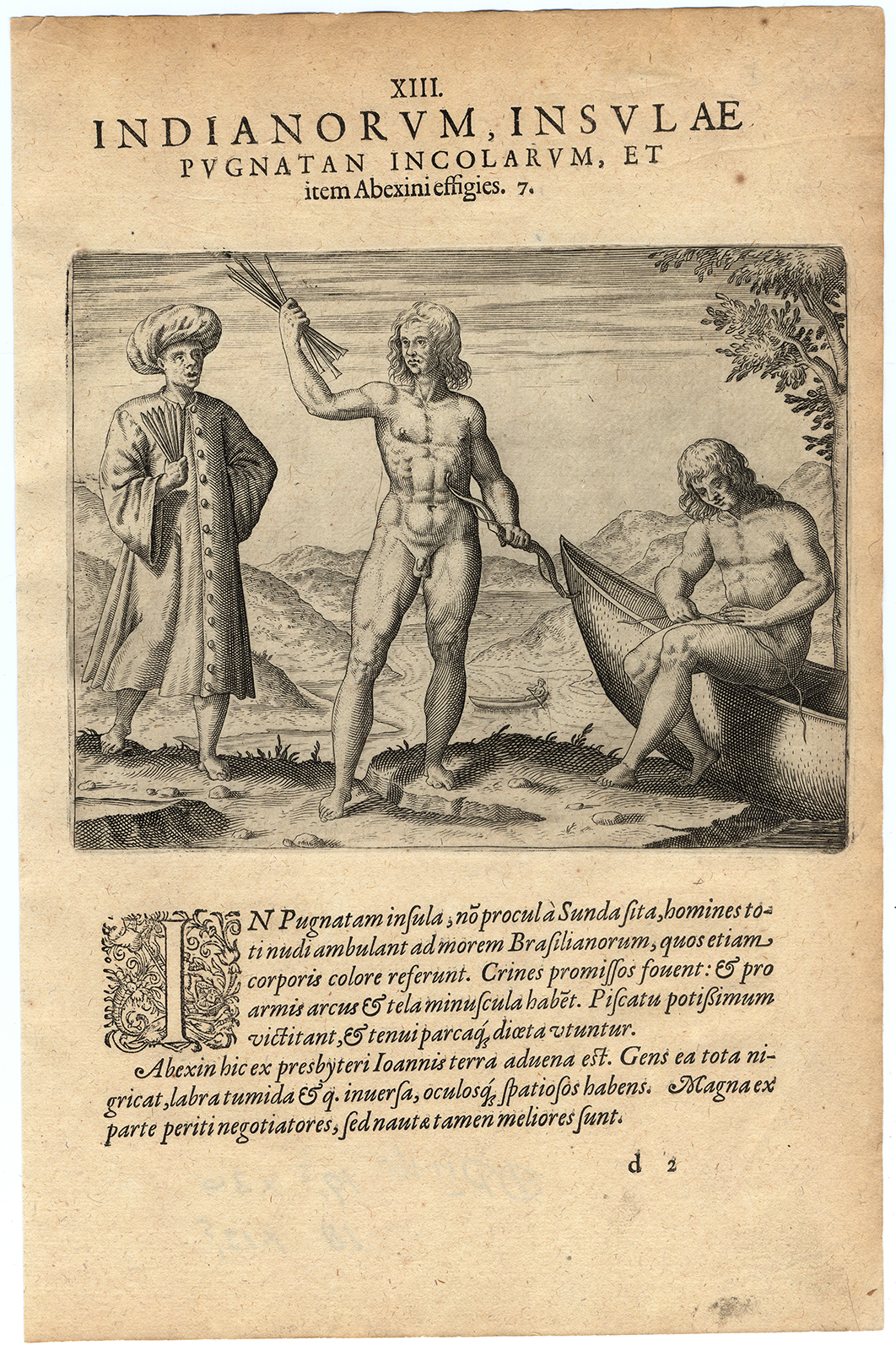 Onderwerp: Plaat 7: Deze plaat toont Indianen zoals Willem Barentsz en zijn bemanning getuige waren tijdens de derde Nederlandse poolreis om de noordoostelijke doorgang naar India te vinden. Barentsz maakte drie reizen (1594, 1595, 1596-1597) op zoek naar de noordoostelijke doorgang naar Azië. Hij bereikte Novaya Zemlya tijdens de eerste twee expedities. Op de derde ontdekte hij per ongeluk Spitsbergen, rond de noordpunt van Nova Zembla en kwam vast te zitten in het ijs. Na de poolwinter vertrok de bemanning in twee kleine boten naar het vasteland. Barentsz stierf onderweg. De omvang van zijn verkenningen en de nauwkeurigheid van zijn kaarten maakten hem tot een van de belangrijkste poolreizigers. De meteorologische gegevens die Barentsz verzamelde, worden nog steeds geraadpleegd. Tekst in het Latijn.