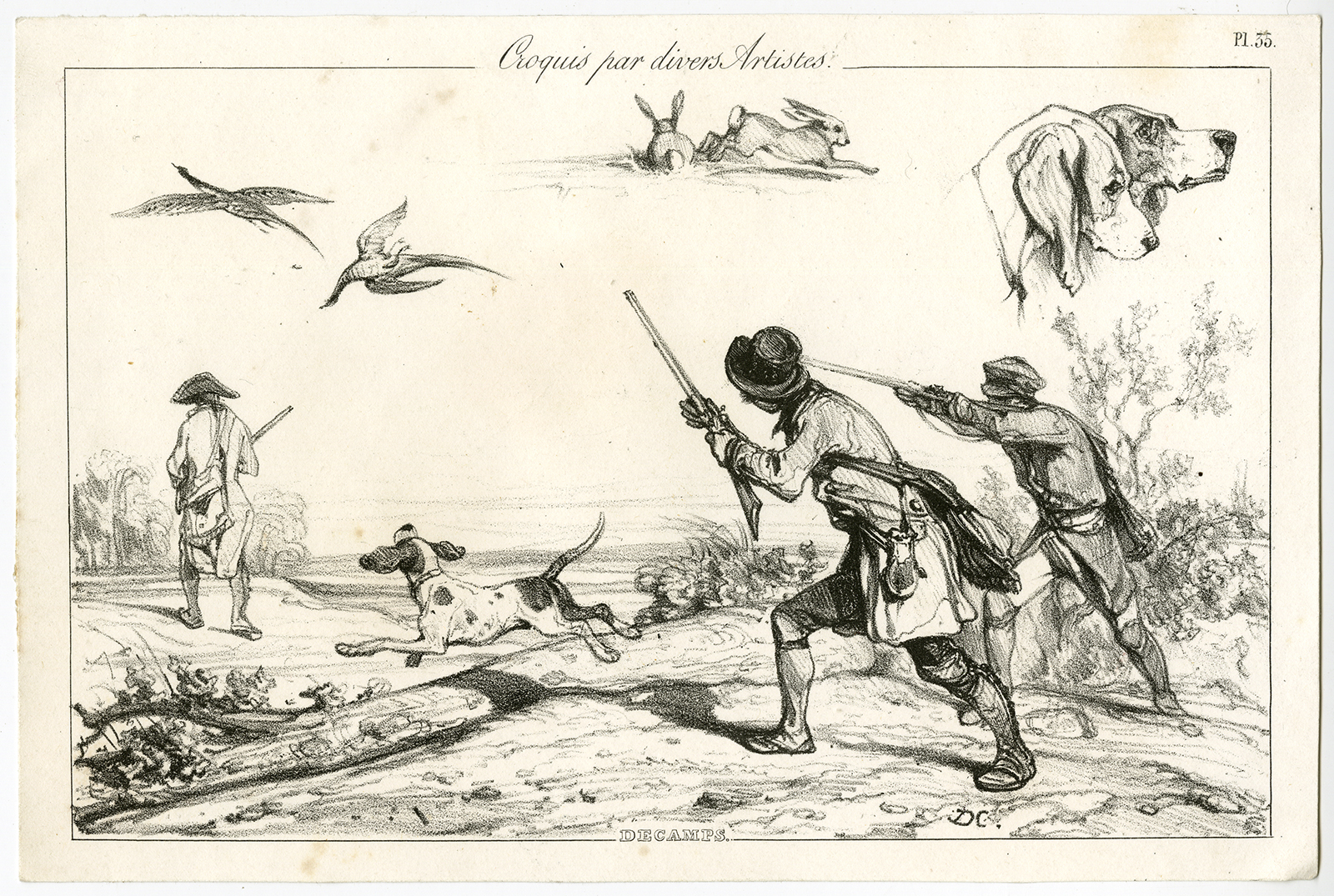 Onderwerp: Plaat: ‘Croquis par divers Artistes’. Dit bord toont een jachttafereel. Drie mannen met geweren schieten op fazanten. Ook hierboven afgebeeld zijn hazen en honden.