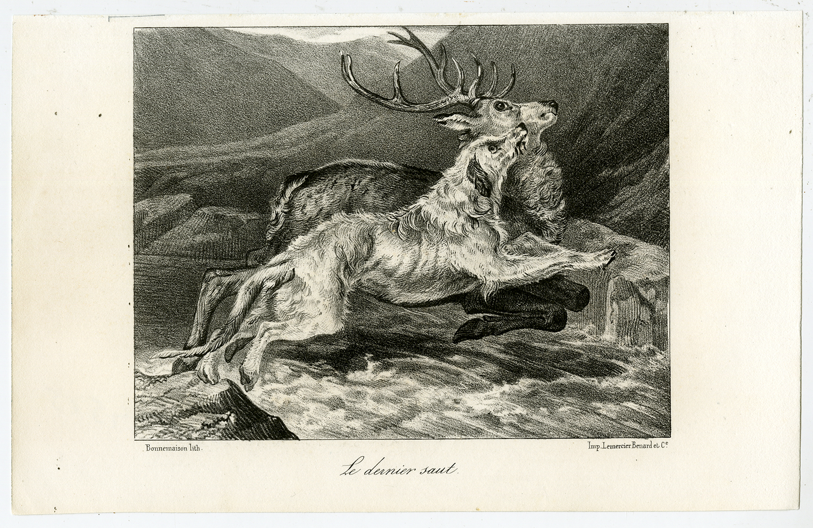 Onderwerp: Antieke prent, getiteld: ”Le dernier saut.” – Deze schaarse originele antieke prent toont een jachttafereel met een hond en een hert. De titel vertaalt zich in; ”De laatste sprong”.
