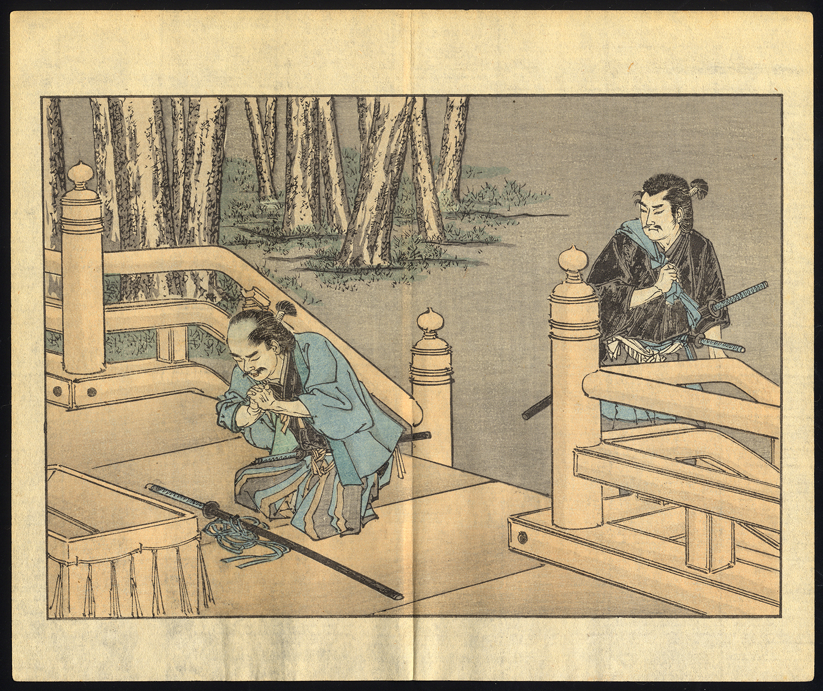 Onderwerp: Plaat 11: een knielende samoerai met de handen in gebed voor een altaar. Zijn katana ligt naast hem op de grond. Een andere samurai bekijkt dit vanaf een kleine afstand. Dit bord toont een scène uit het 19e-eeuwse Japanse leven met mensen in traditionele klederdracht.