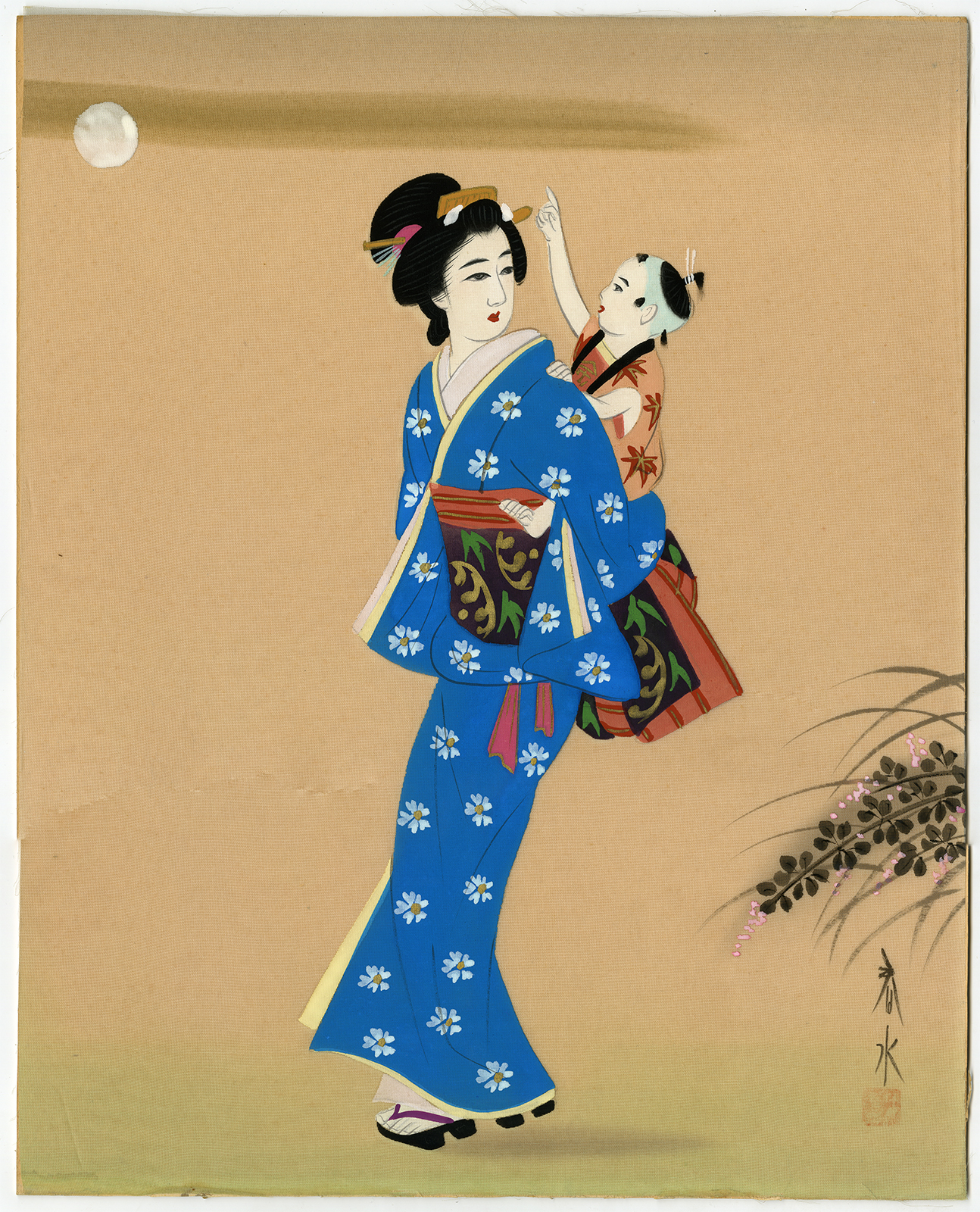 Antieke prent-JAPANSE-KIND-KIMONO-VROUW-MAANLICHT-Anoniem-ca. 1930